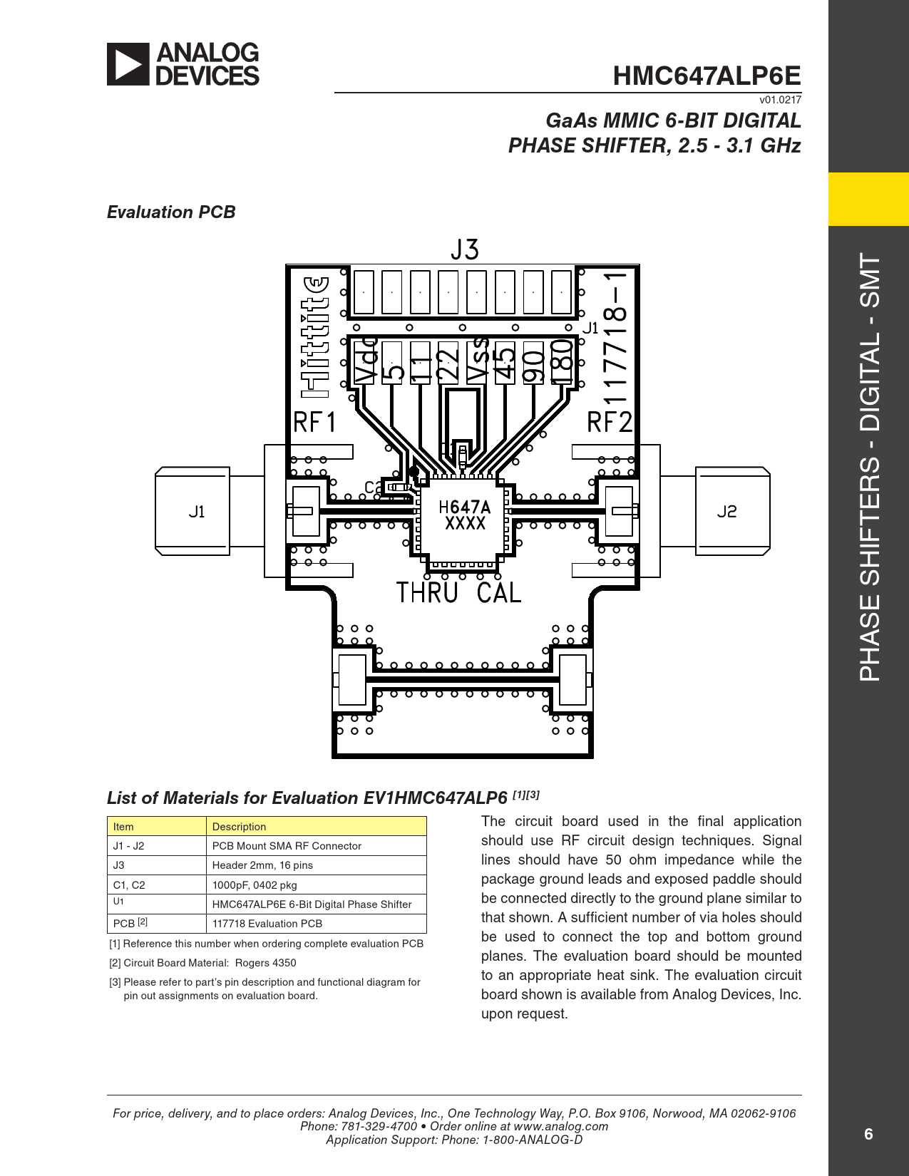 HMC647ALP6E GaAs MMIC 6-BIT DIGITAL PHASE SHIFTER, 2.5 - 3.1 GHz Evaluation PCB
