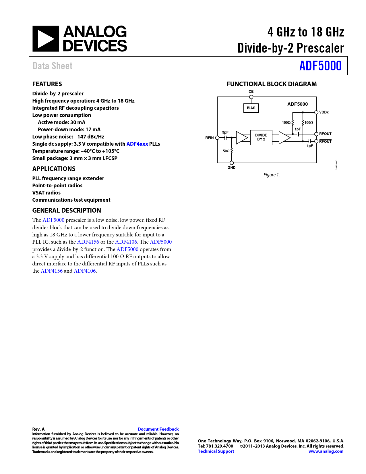 The ADF5000 prescaler is a low noise, low power, fixed RF divider block that can be used to divide down frequencies as high as 18 GHz to a lower frequency suitable for input to a PLL IC, such as the ADF4156 or the ADF4106. The ADF5000 provides a divide-by-2 function. The ADF5000 operates from a 3.3 V supply and has differential 100 Ω RF outputs to allow direct interface to the differential RF inputs of PLLs such as the ADF4156 and ADF4106.