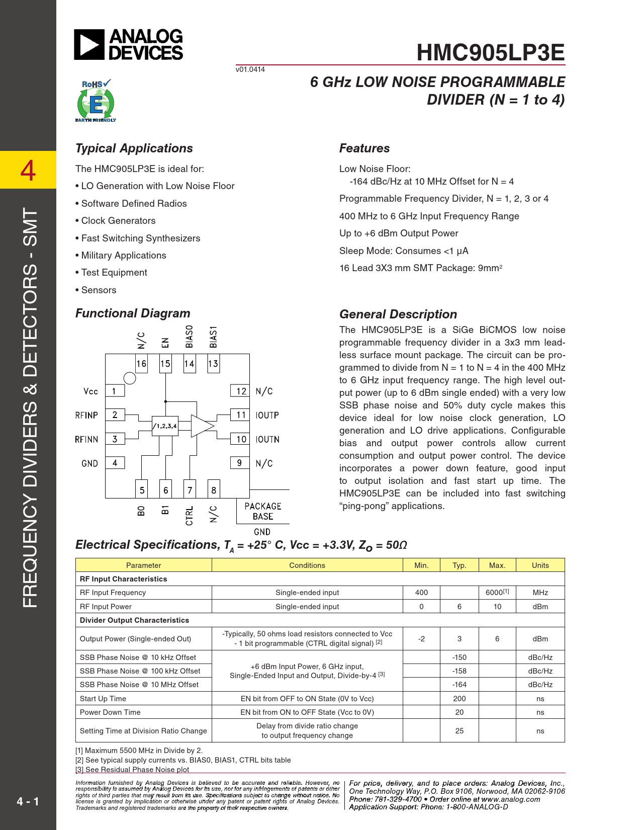 HMC905LP3E v01.0414 6 GHz LOW NOISE PROGRAMMABLEDIVIDER (N = 1 to 4)Typical ApplicationsFeatures 4 The HMC905LP3E is ideal for: Low Noise Floor: -164 dBc/Hz at 10 MHz Offset for N = 4 4 • LO Generation with Low Noise Floor Programmable Frequency Divider, N = 1, 2, 3 or 4 T • Software Defined Radios 400 MHz to 6 GHz Input Frequency Range T M • Clock Generators Up to +6 dBm Output Power M • Fast Switching Synthesizers Sleep Mode: Consumes <1 µA • Military Applications S - S 16 Lead 3X3 mm SMT Package: 9mm2 • Test Equipment S - S R • Sensors R O O T Functional DiagramGeneral Description T C C E The HMC905LP3E is a SiGe BiCMOS low noise E T programmable frequency divider in a 3x3 mm lead- T E less surface mount package. The circuit can be pro- E grammed to divide from N = 1 to N = 4 in the 400 MHz to 6 GHz input frequency range. The high level out- put power (up to 6 dBm single ended) with a very low S & D SSB phase noise and 50% duty cycle makes this S & D R device ideal for low noise clock generation, LO R E generation and LO drive applications. Configurable E ID bias and output power controls al ow current consumption and output power control. The device ID IV incorporates a power down feature, good input IV to output isolation and fast start up time. The Y D HMC905LP3E can be included into fast switching “ping-pong” applications. Y D C C N N E E U Electrical Specifications, T = +25° C, Vcc = +3.3V, ZAo = 50Ω U Q Parameter Conditions Min. Typ. Max. Units Q E RF Input Characteristics E R RF Input Frequency Single-ended input 400 6000[1] MHz R F RF Input Power Single-ended input 0 6 10 dBm F Divider Output Characteristics -Typically, 50 ohms load resistors connected to Vcc Output Power (Single-ended Out) - 1 bit programmable (CTRL digital signal) [2] -2 3 6 dBm SSB Phase Noise @ 10 kHz Offset -150 dBc/Hz +6 dBm Input Power, 6 GHz input, SSB Phase Noise @ 100 kHz Offset -158 dBc/Hz Single-Ended Input and Output, Divide-by-4 [3] SSB Phase Noise @ 10 MHz Offset -164 dBc/Hz Start Up Time EN bit from OFF to ON State (0V to Vcc) 200 ns Power Down Time EN bit from ON to OFF State (Vcc to 0V) 20 ns Delay from divide ratio change Setting Time at Division Ratio Change 25 ns to output frequency change [1] Maximum 5500 MHz in Divide by 2. [2] See typical supply currents vs. BIAS0, BIAS1, CTRL bits table [3] See Residual Phase Noise plot Info F rmoatr p ion rfiurcne is , d hed ebly ivAe n r al y a og D n evd t ice o p s is bla eli c eve o ed t rd o b e e ras: H ccuratite tiatne M d reli iac bl reo . w Ho av wev e C er, n o o For price, delivery, and to place orders: Analog Devices, Inc., responsibility is assumed by Analog Devices for its use, nor for any infringements of patents or other rporation, 20 Alpha Road, Chelmsford, MA 01824 One Technology Way, P.O. Box 9106, Norwood, MA 02062-9106 Phone: 978-250-3343 Fax: 978-250-3373 O rights of third parties that may result from its use. Specifications subject to change without notice. No P rd hone e r O : 7 n 81- -3li 2n 9 e a -47 t w 0 w 0 • O w rd .h e it r o t niltie n .c e ao t m 4 - 1 license is granted by implication or otherwise under any patent or patent rights of Analog Devices. www.analog.com Application Support: Pho Trademarks and registered trademarks are the property of their respective owners. ne: 978-250-33 A 4 p 3 o plica r a tio p n S p u s p @ po h rt itt : P ite ho . n c e o : 1m -800-ANALOG-D