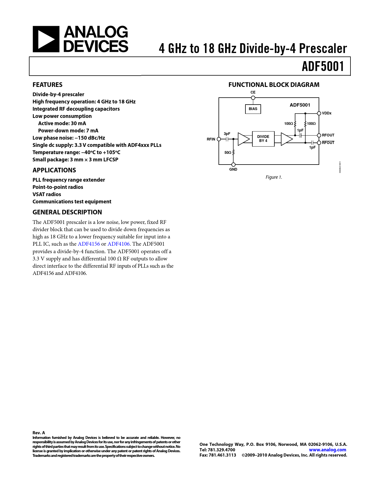 4 GHz to 18 GHz Divide-by-4 Prescaler. ADF5001. FEATURES. FUNCTIONAL BLOCK DIAGRAM. Divide-by-4 prescaler