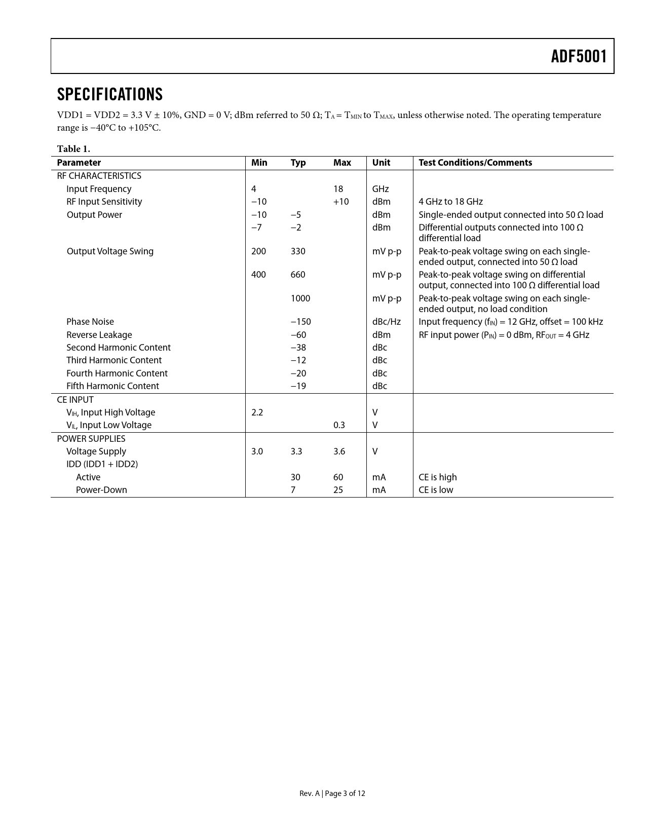 Pages / Page12 / 3 — ADF5001. SPECIFICATIONS. Table 1. Parameter. Min. Typ. Max. Unit. Test …