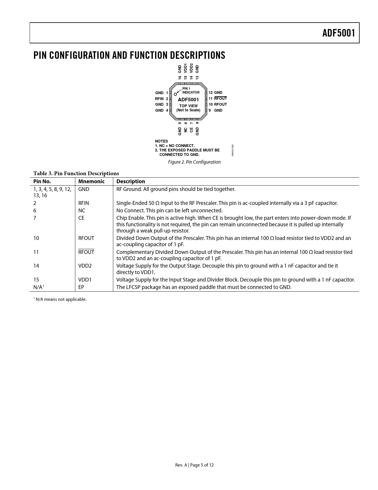 link to page 5 ADF5001PIN CONFIGURATION AND FUNCTION DESCRIPTIONS12DDDDNDDNGVVG65431111PIN 1GND 1INDICATOR12 GNDRFIN 211 RFOUTADF5001GND 310 RFOUTTOP VIEWGND 4(Not to Scale)9GND5678DCEDNNCNGGNOTES 1. NC = NO CONNECT. 02 0 2. THE EXPOSED PADDLE MUST BE 2- 40 CONNECTED TO GND. 08 Figure 2. Pin Configuration Table 3. Pin Function Descriptions Pin No.MnemonicDescription 1, 3, 4, 5, 8, 9, 12, GND RF Ground. All ground pins should be tied together. 13, 16 2 RFIN Single-Ended 50 Ω Input to the RF Prescaler. This pin is ac-coupled internally via a 3 pF capacitor. 6 NC No Connect. This pin can be left unconnected. 7 CE Chip Enable. This pin is active high. When CE is brought low, the part enters into power-down mode. If this functionality is not required, the pin can remain unconnected because it is pulled up internally through a weak pull-up resistor. 10 RFOUT Divided Down Output of the Prescaler. This pin has an internal 100 Ω load resistor tied to VDD2 and an ac-coupling capacitor of 1 pF. 11 RFOUT Complementary Divided Down Output of the Prescaler. This pin has an internal 100 Ω load resistor tied to VDD2 and an ac-coupling capacitor of 1 pF. 14 VDD2 Voltage Supply for the Output Stage. Decouple this pin to ground with a 1 nF capacitor and tie it directly to VDD1. 15 VDD1 Voltage Supply for the Input Stage and Divider Block. Decouple this pin to ground with a 1 nF capacitor. N/A1 EP The LFCSP package has an exposed paddle that must be connected to GND. 1 N/A means not applicable. Rev. A | Page 5 of 12 Document Outline FEATURES APPLICATIONS GENERAL DESCRIPTION FUNCTIONAL BLOCK DIAGRAM TABLE OF CONTENTS REVISION HISTORY SPECIFICATIONS ABSOLUTE MAXIMUM RATINGS ESD CAUTION PIN CONFIGURATION AND FUNCTION DESCRIPTIONS TYPICAL PERFORMANCE CHARACTERISTICS EVALUATION BOARD PCB PCB MATERIAL STACK-UP BILL OF MATERIALS APPLICATION CIRCUIT OUTLINE DIMENSIONS ORDERING GUIDE NOTES NOTES NOTES