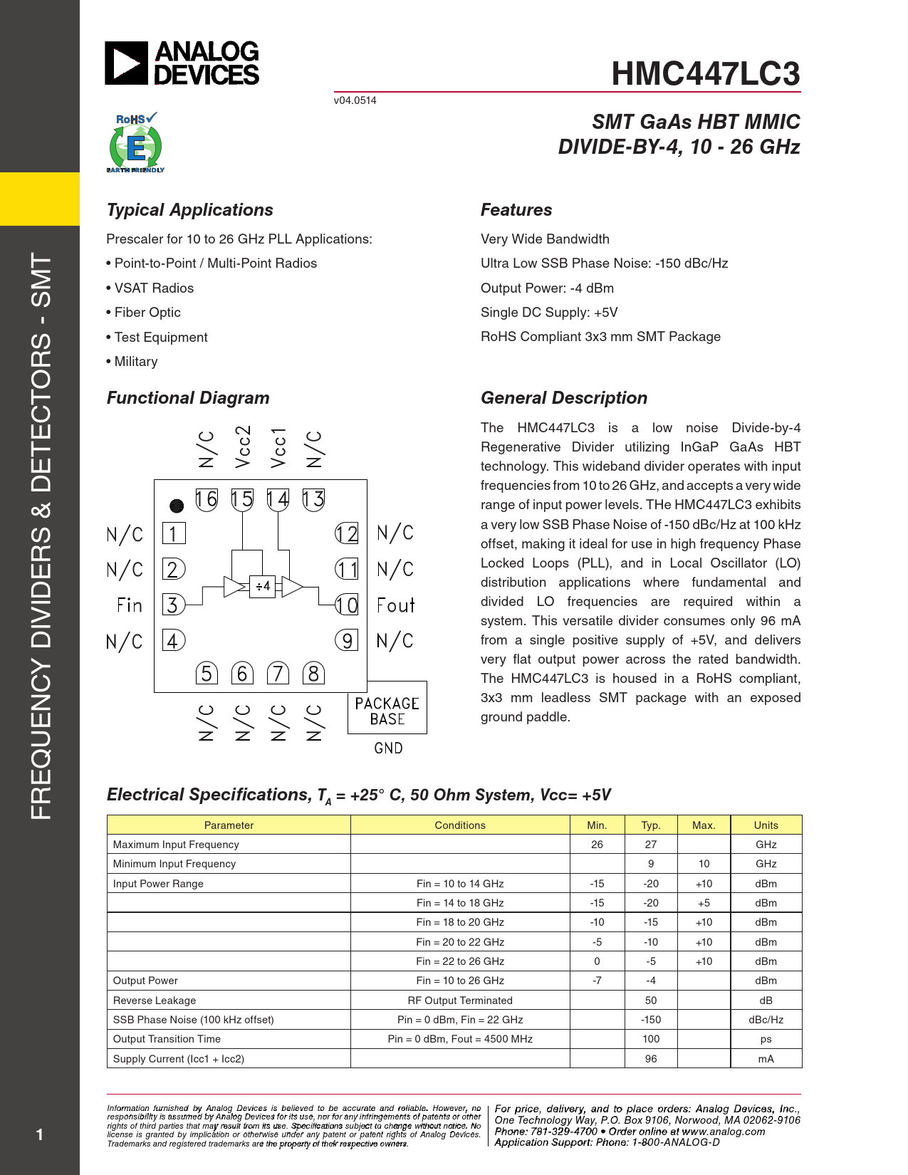 HMC447LC3. SMT GaAs HBT MMIC. DIVIDE-BY-4, 10 - 26 GHz. Typical Applications. Features. Functional Diagram. General Description