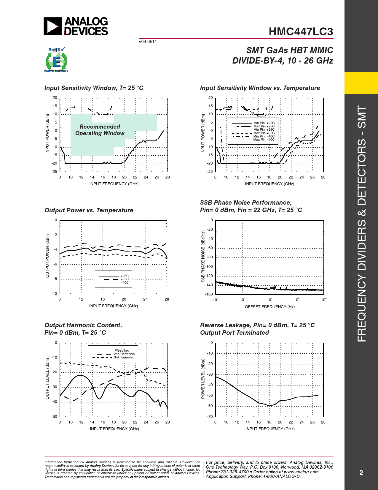HMC447LC3. SMT GaAs HBT MMIC. DIVIDE-BY-4, 10 - 26 GHz. Input Sensitivity Window, T= 25 °C
