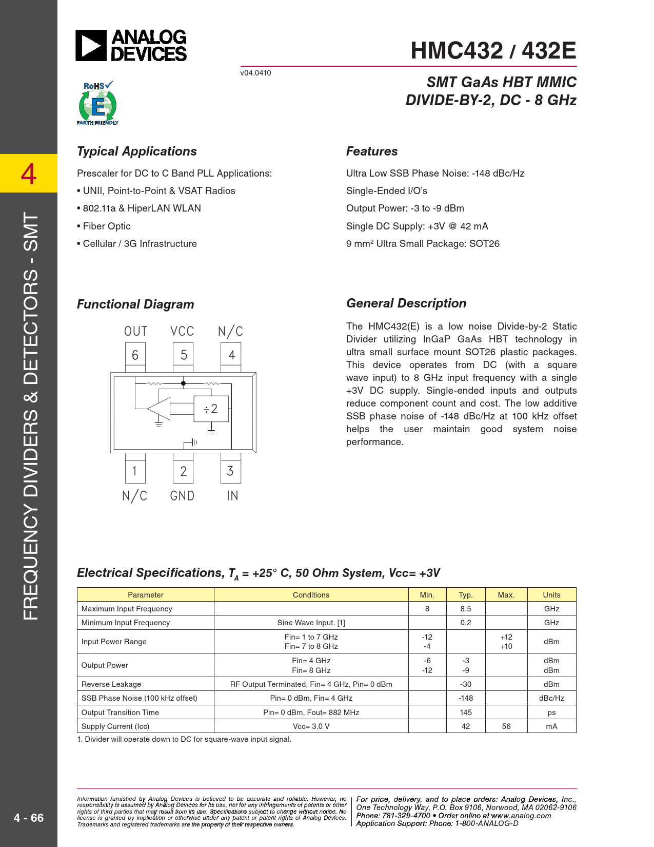 HMC432 / 432E. SMT GaAs HBT MMIC. DIVIDE-BY-2, DC - 8 GHz. Typical Applications. Features. Functional Diagram. General Description