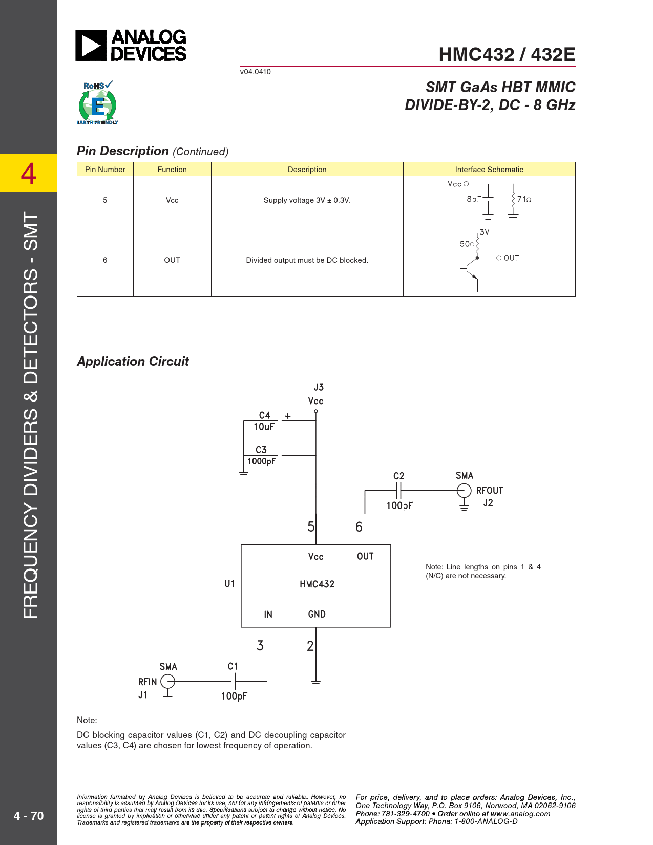 HMC432 / 432E. SMT GaAs HBT MMIC. DIVIDE-BY-2, DC - 8 GHz. Pin Description. Application Circuit. 4 - 70