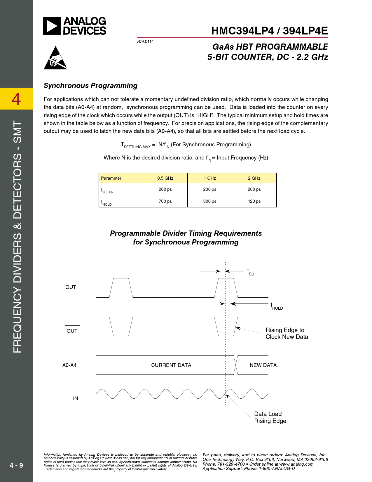4 For applications which can not tolerate a momentary undefined division ratio, which normal y occurs while changing 4 the data bits (A0-A4) at random, synchronous programming can be used. Data is loaded into the counter on every rising edge of the clock which occurs while the output (OUT) is “HIGH”. The typical minimum setup and hold times are t shown in the table below as a function of frequency. For precision applications, the rising edge of the complementary t M output may be used to latch the new data bits (A0-A4), so that all bits are settled before the next load cycle. M s s T = N/f (For Synchronous Programming) SETTLING MAX IN s - Where N is the desired division ratio, and f = Input Frequency (Hz) IN s - r r o o t Parameter 0.5 GHz 1 GHz 2 GHz t c t 200 ps 200 ps 200 ps c e SETUP e t t 700 ps 300 ps 120 ps HOLD t e e s & D