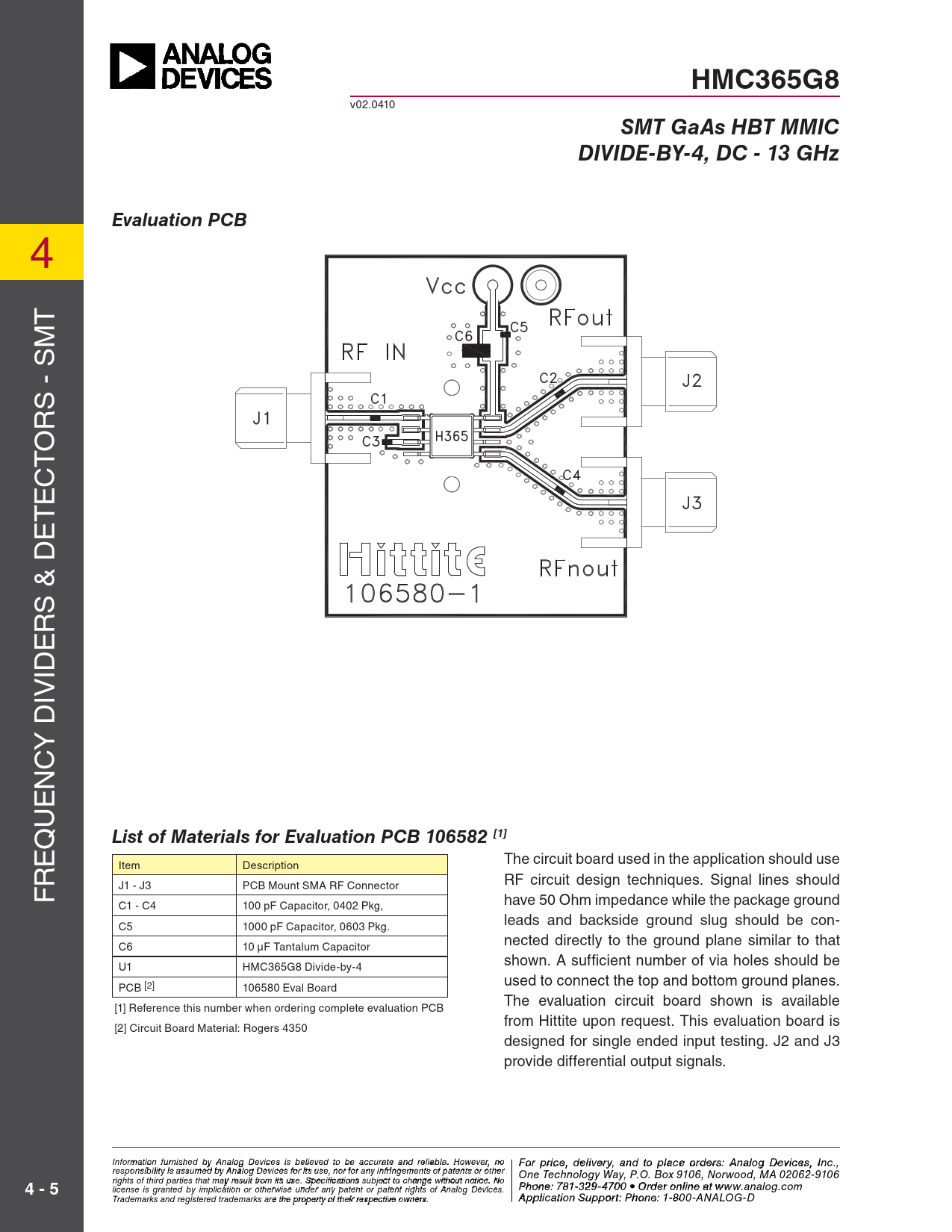 HMC365G8 v02.0410 SMT GaAs HBT MMICDIVIDE-BY-4, DC - 13 GHzEvaluation PCB 4 T S - SM R O T C E T E & D S R E ID IV Y D NC E U Q List of Materials for Evaluation PCB 106582 [1] E The circuit board used in the application should use Item Description R RF circuit design techniques. Signal lines should F J1 - J3 PCB Mount SMA RF Connector have 50 Ohm impedance while the package ground C1 - C4 100 pF Capacitor, 0402 Pkg, leads and backside ground slug should be con- C5 1000 pF Capacitor, 0603 Pkg. nected directly to the ground plane similar to that C6 10 μF Tantalum Capacitor shown. A sufficient number of via holes should be U1 HMC365G8 Divide-by-4 used to connect the top and bottom ground planes. PCB [2] 106580 Eval Board The evaluation circuit board shown is available [1] Reference this number when ordering complete evaluation PCB from Hittite upon request. This evaluation board is [2] Circuit Board Material: Rogers 4350 designed for single ended input testing. J2 and J3 provide differential output signals. Info F rmoatr pr ion f iurcne, de ished b ly iv A e n r al y o a g D n evd to p ices is bla eli c eve o ed t rde o be ras: H ccuratite tiatne M d reli iacr ble ow . Ho av wev e C er, n o o rpo Fora r t p iro ic n e ,, 2 d 0 eli A ve lrpha R y, and toad, C o place hoel rd m er s s fo : Ard, MA 01 nalog Devic 8 e 2 s 4 , Inc., responsibility is assumed by Analog Devices for its use, nor for any infringements of patents or other One Technology Way, P.O. Box 9106, Norwood, MA 02062-9106 rights of third parties that may result from its use. Specifications subject to change without notice. No 4 - 5 Phone: 978-250-3343 Fax: 978-250-3373 O P rde hone r O : 7 n 81- -3li 2n 9 e a -47 t w 0 w 0 • O w rd .ehit r o t nilte in .c e ao t m license is granted by implication or otherwise under any patent or patent rights of Analog Devices. www.analog.com Application Support: Pho Trademarks and registered trademarks are the property of their respective owners. ne: 978-250-33 A 4 p 3 o plica r app tion Su s p @ po h rt itt : P ite ho .c ne o : 1m -800-ANALOG-D
