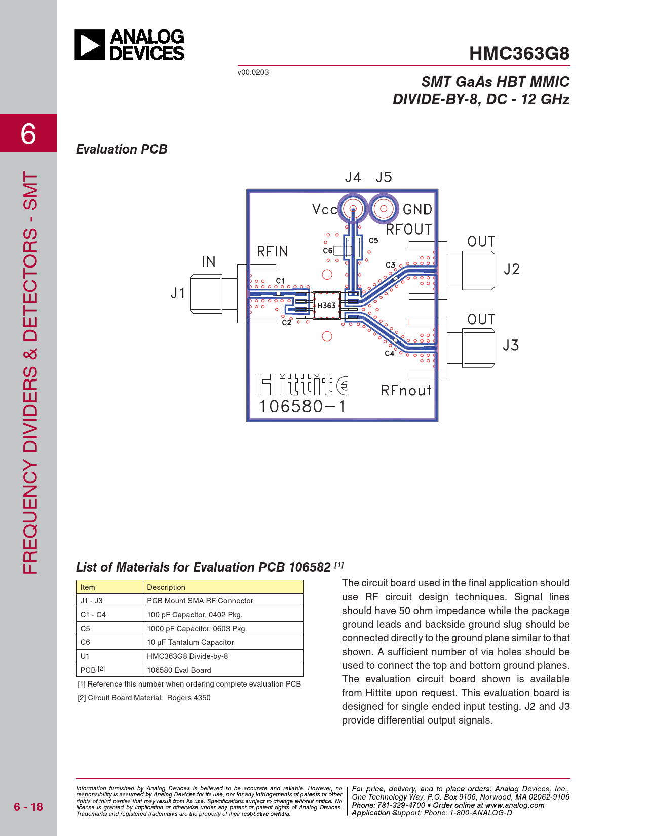 HMC363G8. SMT GaAs HBT MMIC. DIVIDE-BY-8, DC - 12 GHz. Evaluation PCB. List of Materials for Evaluation PCB 106582 [1]. 6 - 18