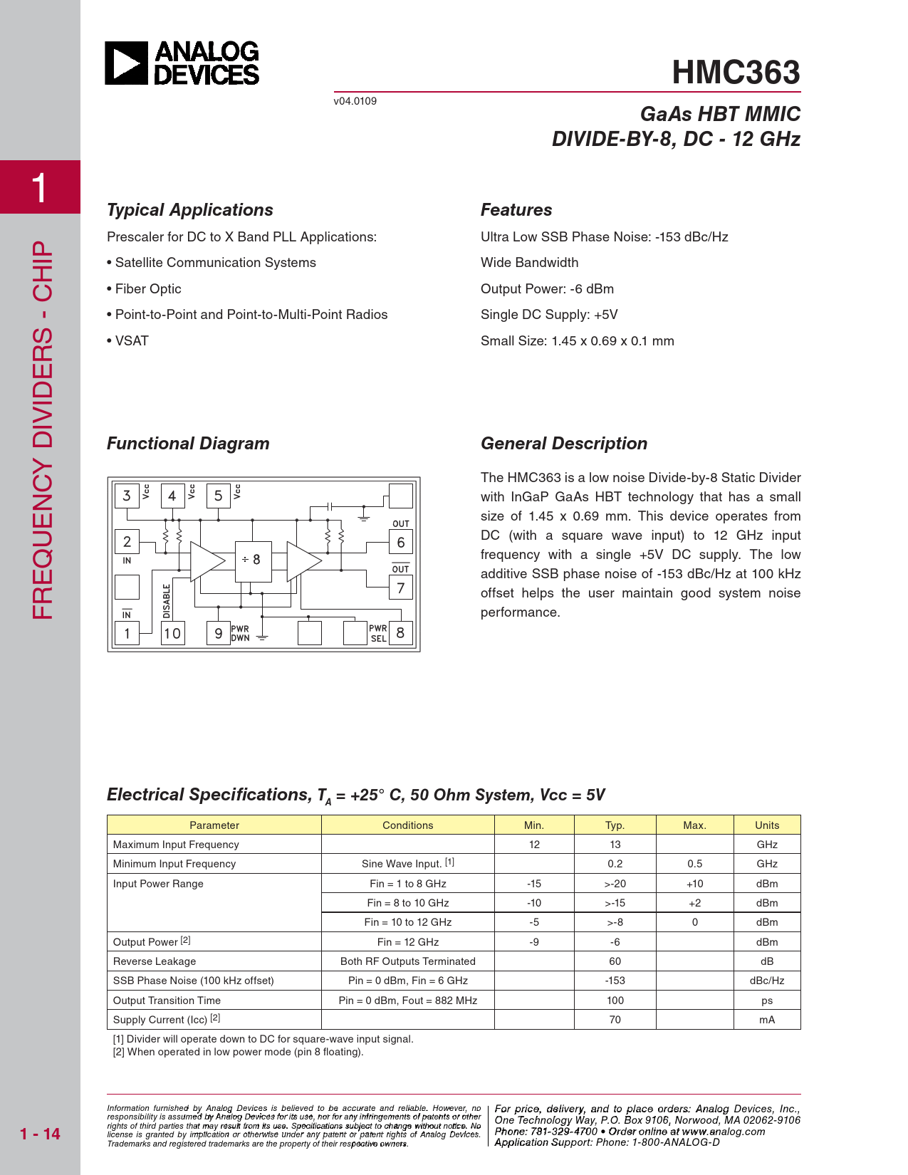 HMC363. GaAs HBT MMIC. DIVIDE-BY-8, DC - 12 GHz. Typical Applications. Features. Functional Diagram. General Description