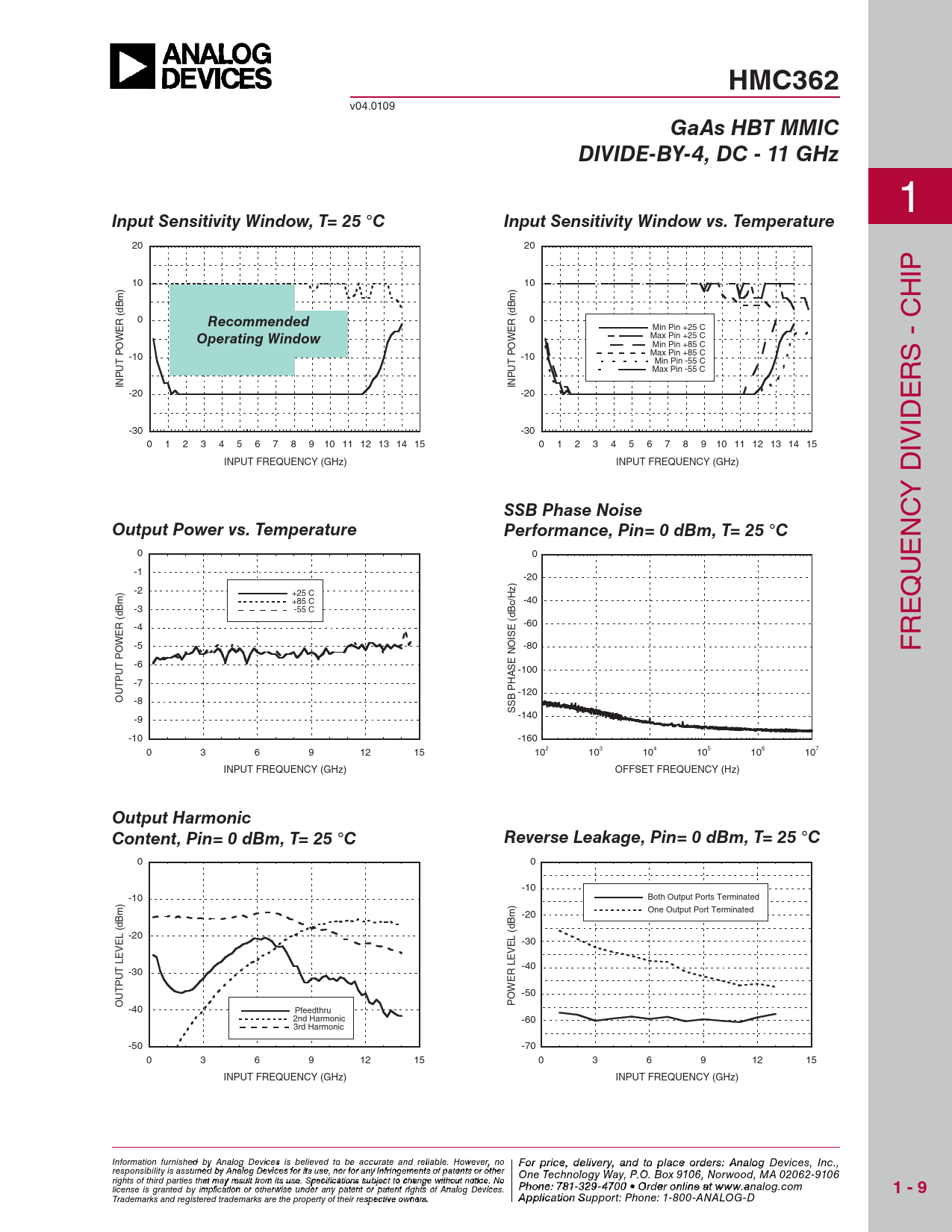 HMC362. GaAs HBT MMIC. DIVIDE-BY-4, DC - 11 GHz. Input Sensitivity Window, T= 25 °C. Input Sensitivity Window vs. Temperature