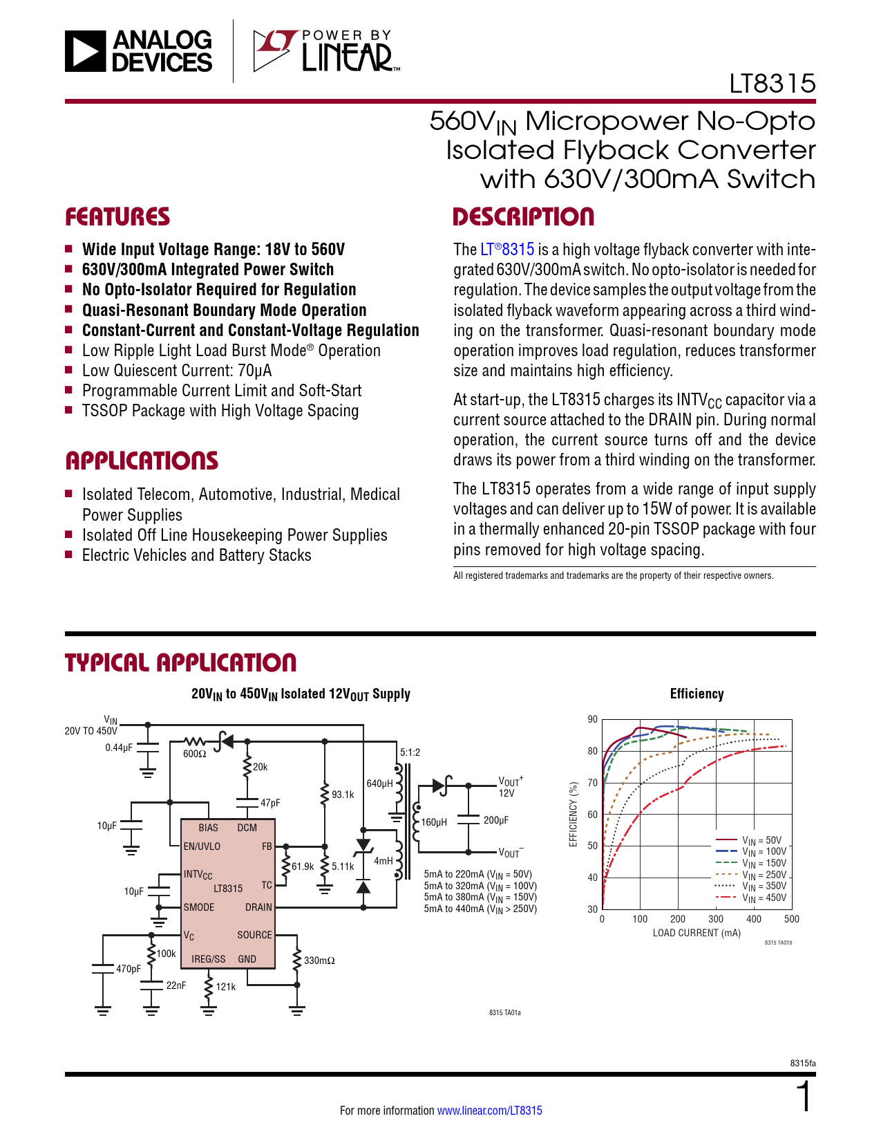 LT8315 560VIN Micropower No-Opto Isolated Flyback Converter with 630V/300mA Switch FEATURESDESCRIPTION n Wide Input Voltage Range: 18V to 560V The LT®8315 is a high voltage flyback converter with inte- n 630V/300mA Integrated Power Switch grated 630V/300mA switch. No opto-isolator is needed for n No Opto-Isolator Required for Regulation regulation. The device samples the output voltage from the n Quasi-Resonant Boundary Mode Operation isolated flyback waveform appearing across a third wind- n Constant-Current and Constant-Voltage Regulation ing on the transformer. Quasi-resonant boundary mode n Low Ripple Light Load Burst Mode® Operation operation improves load regulation, reduces transformer n Low Quiescent Current: 70μA size and maintains high efficiency. n Programmable Current Limit and Soft-Start At start-up, the LT8315 charges its INTVCC capacitor via a n TSSOP Package with High Voltage Spacing current source attached to the DRAIN pin. During normal operation, the current source turns off and the device APPLICATIONS draws its power from a third winding on the transformer. n The LT8315 operates from a wide range of input supply Isolated Telecom, Automotive, Industrial, Medical voltages and can deliver up to 15W of power. It is available Power Supplies n in a thermally enhanced 20-pin TSSOP package with four Isolated Off Line Housekeeping Power Supplies n pins removed for high voltage spacing. Electric Vehicles and Battery Stacks All registered trademarks and trademarks are the property of their respective owners. TYPICAL APPLICATION20VIN to 450VIN Isolated 12VOUT SupplyEfficiency VIN 90 20V TO 450V 0.44µF 600Ω 5:1:2 80 20k + 640µH VOUT 70 93.1k 12V 47pF 60 10µF 160µH 200µF BIAS DCM V EN/UVLO FB EFFICIENCY (%) IN = 50V V – 50 OUT VIN = 100V 4mH 61.9k 5.11k VIN = 150V INTVCC 5mA to 220mA (VIN = 50V) V 40 IN = 250V 10µF TC LT8315 5mA to 320mA (VIN = 100V) VIN = 350V 5mA to 380mA (VIN = 150V) VIN = 450V SMODE DRAIN 5mA to 440mA (VIN > 250V) 30 0 100 200 300 400 500 VC SOURCE LOAD CURRENT (mA) 8315 TA01b 100k IREG/SS GND 330mΩ 470pF 22nF 121k 8315 TA01a 8315fa For more information www.linear.com/LT8315 1 Document Outline FEATURES APPLICATIONS DESCRIPTION TYPICAL APPLICATION ABSOLUTE MAXIMUM RATINGS PIN CONFIGURATION ORDER INFORMATION ELECTRICAL CHARACTERISTICS TYPICAL PERFORMANCE CHARACTERISTICS PIN FUNCTIONS BLOCK DIAGRAM OPERATION APPLICATIONS INFORMATION PACKAGE DESCRIPTION REVISION HISTORY TYPICAL APPLICATION RELATED PARTS
