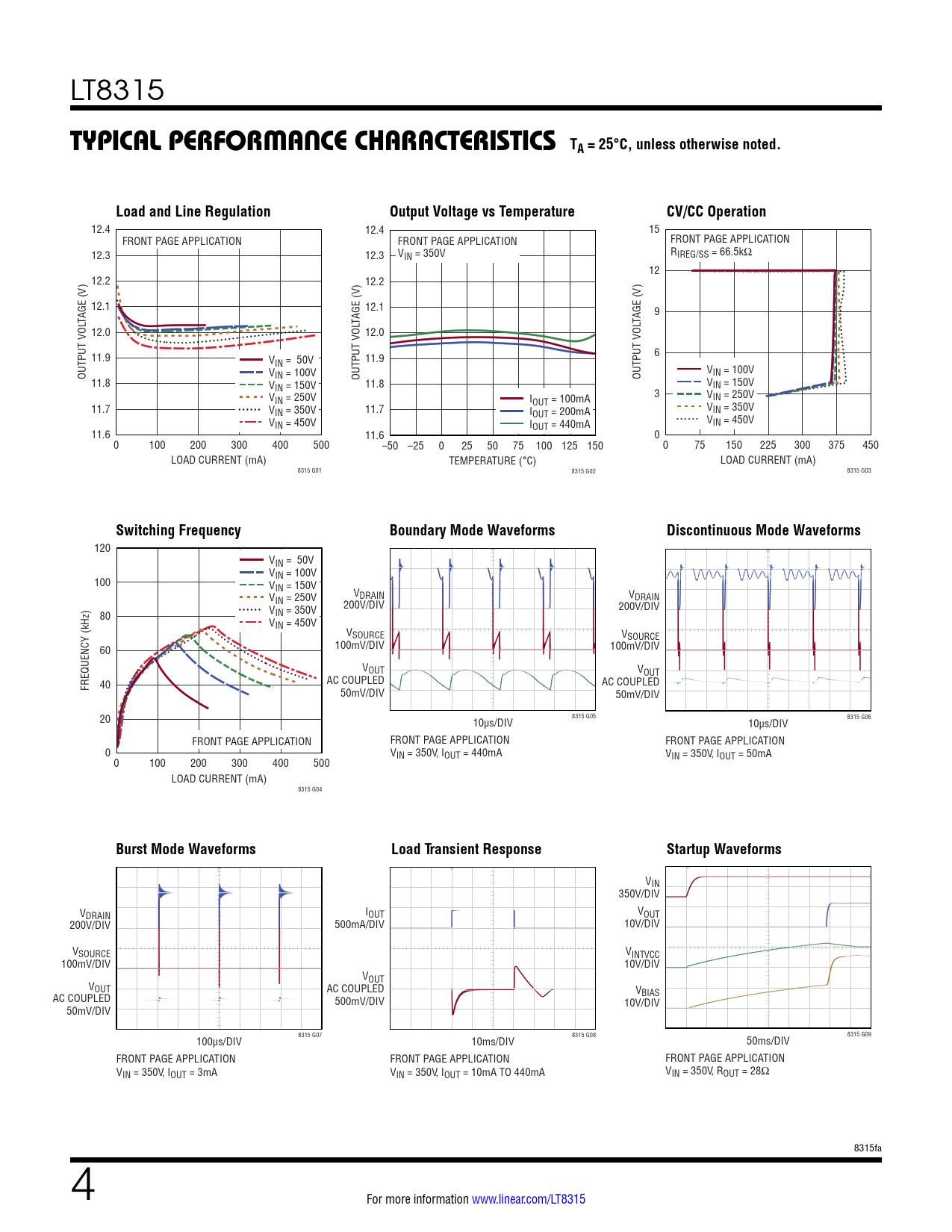 120 VIN = 50V VIN = 100V 100 VIN = 150V V V V IN = 250V DRAIN DRAIN V 200V/DIV 200V/DIV IN = 350V 80 VIN = 450V VSOURCE VSOURCE 60 100mV/DIV 100mV/DIV VOUT VOUT FREQUENCY (kHz) 40 AC COUPLED AC COUPLED 50mV/DIV 50mV/DIV 20 10µs/DIV 8315 G05 10µs/DIV 8315 G06 FRONT PAGE APPLICATION FRONT PAGE APPLICATION FRONT PAGE APPLICATION 0 VIN = 350V, IOUT = 440mA VIN = 350V, IOUT = 50mA 0 100 200 300 400 500 LOAD CURRENT (mA) 8315 G04
