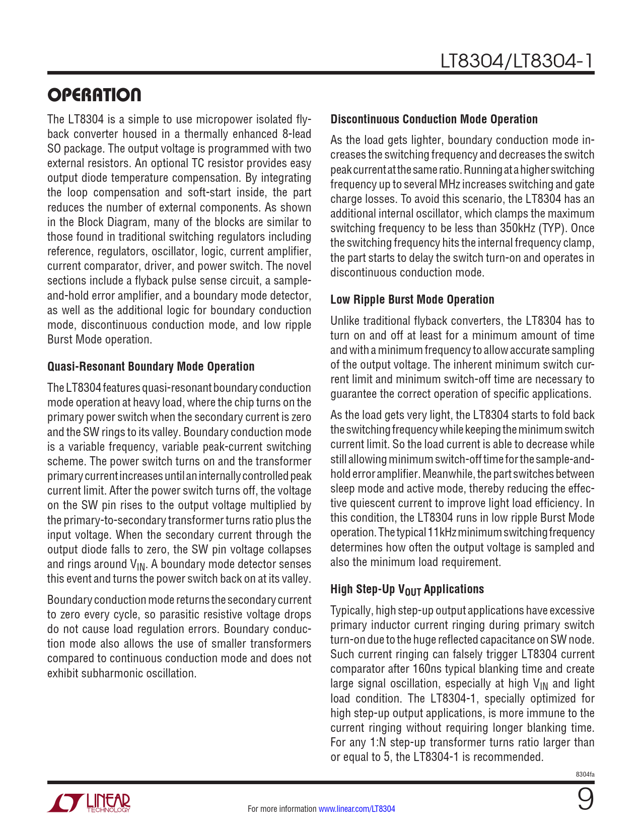 LT8304/LT8304-1 OPERATION The LT8304 is a simple to use micropower isolated fly- Discontinuous Conduction Mode Operation back converter housed in a thermally enhanced 8-lead As the load gets lighter, boundary conduction mode in- SO package. The output voltage is programmed with two creases the switching frequency and decreases the switch external resistors. An optional TC resistor provides easy peak current at the same ratio. Running at a higher switching output diode temperature compensation. By integrating frequency up to several MHz increases switching and gate the loop compensation and soft-start inside, the part charge losses. To avoid this scenario, the LT8304 has an reduces the number of external components. As shown additional internal oscillator, which clamps the maximum in the Block Diagram, many of the blocks are similar to switching frequency to be less than 350kHz (TYP). Once those found in traditional switching regulators including the switching frequency hits the internal frequency clamp, reference, regulators, oscillator, logic, current amplifier, the part starts to delay the switch turn-on and operates in current comparator, driver, and power switch. The novel discontinuous conduction mode. sections include a flyback pulse sense circuit, a sample- and-hold error amplifier, and a boundary mode detector, Low Ripple Burst Mode Operation as well as the additional logic for boundary conduction mode, discontinuous conduction mode, and low ripple Unlike traditional flyback converters, the LT8304 has to Burst Mode operation. turn on and off at least for a minimum amount of time and with a minimum frequency to allow accurate sampling Quasi-Resonant Boundary Mode Operation of the output voltage. The inherent minimum switch cur- rent limit and minimum switch-off time are necessary to The LT8304 features quasi-resonant boundary conduction guarantee the correct operation of specific applications. mode operation at heavy load, where the chip turns on the primary power switch when the secondary current is zero As the load gets very light, the LT8304 starts to fold back and the SW rings to its valley. Boundary conduction mode the switching frequency while keeping the minimum switch is a variable frequency, variable peak-current switching current limit. So the load current is able to decrease while scheme. The power switch turns on and the transformer still allowing minimum switch-off time for the sample-and- primary current increases until an internally controlled peak hold error amplifier. Meanwhile, the part switches between current limit. After the power switch turns off, the voltage sleep mode and active mode, thereby reducing the effec- on the SW pin rises to the output voltage multiplied by tive quiescent current to improve light load efficiency. In the primary-to-secondary transformer turns ratio plus the this condition, the LT8304 runs in low ripple Burst Mode input voltage. When the secondary current through the operation. The typical 11kHz minimum switching frequency output diode falls to zero, the SW pin voltage collapses determines how often the output voltage is sampled and and rings around VIN. A boundary mode detector senses also the minimum load requirement. this event and turns the power switch back on at its valley. High Step-Up V Boundary conduction mode returns the secondary current OUT Applications to zero every cycle, so parasitic resistive voltage drops Typically, high step-up output applications have excessive do not cause load regulation errors. Boundary conduc- primary inductor current ringing during primary switch tion mode also allows the use of smaller transformers turn-on due to the huge reflected capacitance on SW node. compared to continuous conduction mode and does not Such current ringing can falsely trigger LT8304 current exhibit subharmonic oscillation. comparator after 160ns typical blanking time and create large signal oscillation, especially at high VIN and light load condition. The LT8304-1, specially optimized for high step-up output applications, is more immune to the current ringing without requiring longer blanking time. For any 1:N step-up transformer turns ratio larger than or equal to 5, the LT8304-1 is recommended. 8304fa For more information www.linear.com/LT8304 9 Document Outline Features Applications Description Typical Application Absolute Maximum Ratings Pin Configuration Order Information Electrical Characteristics Typical Performance Characteristics Pin Functions Block Diagram Operation Applications Information Package Description Typical Application Related Parts Features Applications Typical Application Description Absolute Maximum Ratings Order Information Pin Configuration Electrical Characteristics Typical Performance Characteristics Pin Functions Block Diagram Operation Applications Information Package Description Revision History Typical Application Related Parts
