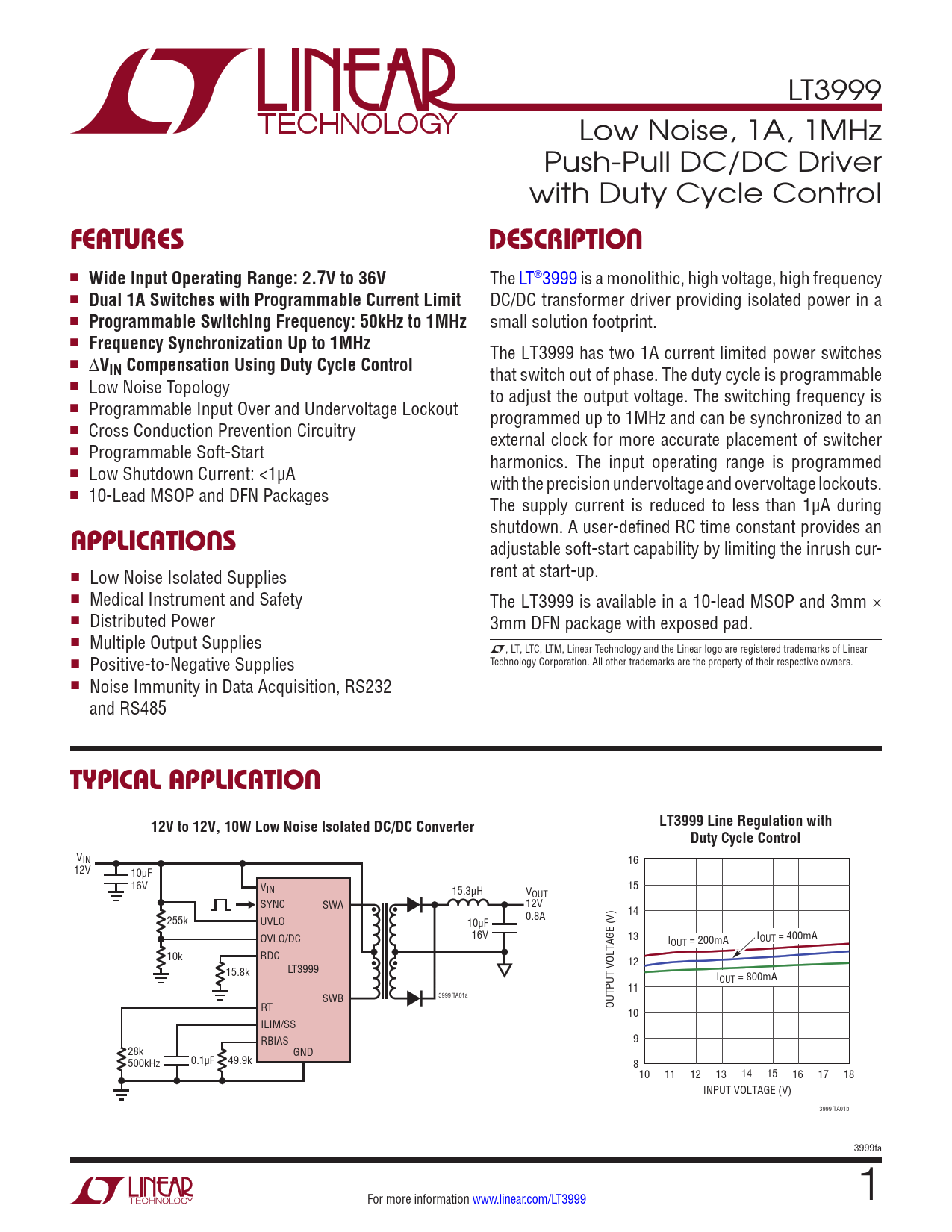 LT3999 Low Noise, 1A, 1MHz Push-Pull DC/DC Driver with Duty Cycle Control