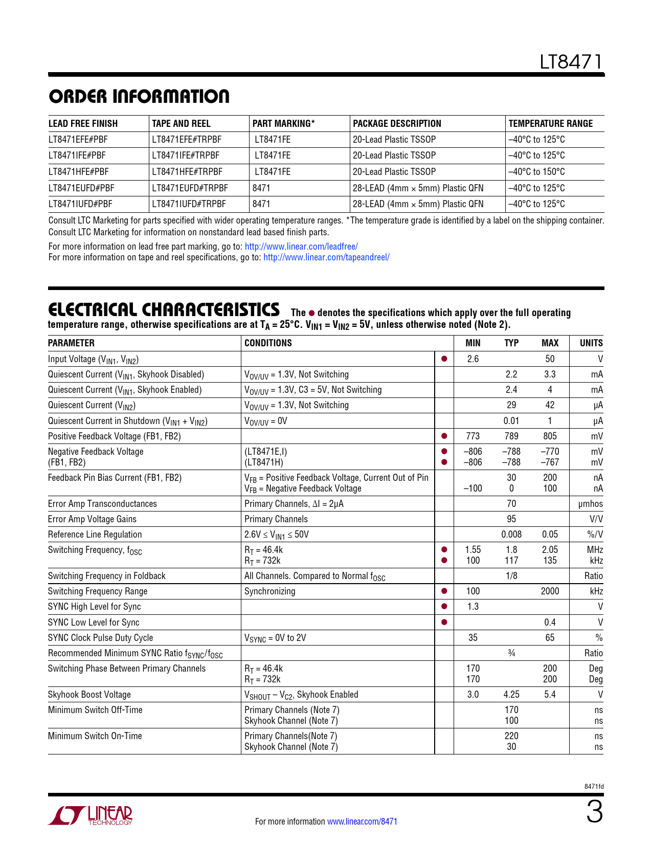 LT8471 orDer inForMaTion LEAD FREE FINISHTAPE AND REELPART MARKING*PACKAGE DESCRIPTIONTEMPERATURE RANGE LT8471EFE#PBF LT8471EFE#TRPBF LT8471FE 20-Lead Plastic TSSOP –40°C to 125°C LT8471IFE#PBF LT8471IFE#TRPBF LT8471FE 20-Lead Plastic TSSOP –40°C to 125°C LT8471HFE#PBF LT8471HFE#TRPBF LT8471FE 20-Lead Plastic TSSOP –40°C to 150°C LT8471EUFD#PBF LT8471EUFD#TRPBF 8471 28-LEAD (4mm × 5mm) Plastic QFN –40°C to 125°C LT8471IUFD#PBF LT8471IUFD#TRPBF 8471 28-LEAD (4mm × 5mm) Plastic QFN –40°C to 125°C Consult LTC Marketing for parts specified with wider operating temperature ranges. *The temperature grade is identified by a label on the shipping container. Consult LTC Marketing for information on nonstandard lead based finish parts. For more information on lead free part marking, go to: http://www.linear.com/leadfree/ For more information on tape and reel specifications, go to: http://www.linear.com/tapeandreel/ e lecTrical characTerisTics The l denotes the specifications which apply over the full operatingtemperature range, otherwise specifications are at TA = 25°C. VIN1 = VIN2 = 5V, unless otherwise noted (Note 2). PARAMETERCONDITIONSMINTYPMAXUNITS Input Voltage (VIN1, VIN2) l 2.6 50 V Quiescent Current (VIN1, Skyhook Disabled) VOV/UV = 1.3V, Not Switching 2.2 3.3 mA Quiescent Current (VIN1, Skyhook Enabled) VOV/UV = 1.3V, C3 = 5V, Not Switching 2.4 4 mA Quiescent Current (VIN2) VOV/UV = 1.3V, Not Switching 29 42 µA Quiescent Current in Shutdown (VIN1 + VIN2) VOV/UV = 0V 0.01 1 μA Positive Feedback Voltage (FB1, FB2) l 773 789 805 mV Negative Feedback Voltage (LT8471E,I) l –806 –788 –770 mV (FB1, FB2) (LT8471H) l –806 –788 –767 mV Feedback Pin Bias Current (FB1, FB2) VFB = Positive Feedback Voltage, Current Out of Pin 30 200 nA VFB = Negative Feedback Voltage –100 0 100 nA Error Amp Transconductances Primary Channels, ∆I = 2μA 70 μmhos Error Amp Voltage Gains Primary Channels 95 V/V Reference Line Regulation 2.6V ≤ VIN1 ≤ 50V 0.008 0.05 %/V Switching Frequency, fOSC RT = 46.4k l 1.55 1.8 2.05 MHz RT = 732k l 100 117 135 kHz Switching Frequency in Foldback All Channels. Compared to Normal fOSC 1/8 Ratio Switching Frequency Range Synchronizing l 100 2000 kHz SYNC High Level for Sync l 1.3 V SYNC Low Level for Sync l 0.4 V SYNC Clock Pulse Duty Cycle VSYNC = 0V to 2V 35 65 % Recommended Minimum SYNC Ratio fSYNC/fOSC ¾ Ratio Switching Phase Between Primary Channels RT = 46.4k 170 200 Deg RT = 732k 170 200 Deg Skyhook Boost Voltage VSHOUT – VC2, Skyhook Enabled 3.0 4.25 5.4 V Minimum Switch Off-Time Primary Channels (Note 7) 170 ns Skyhook Channel (Note 7) 100 ns Minimum Switch On-Time Primary Channels(Note 7) 220 ns Skyhook Channel (Note 7) 30 ns 8471fd For more information www.linear.com/8471 3 Document Outline Features Applications Description Typical Application Absolute Maximum Ratings Pin Configuration Order Information Electrical Characteristics Typical Performance Characteristics Pin Functions Block Diagram Operation Applications Information Typical Applications Package Description Related Parts