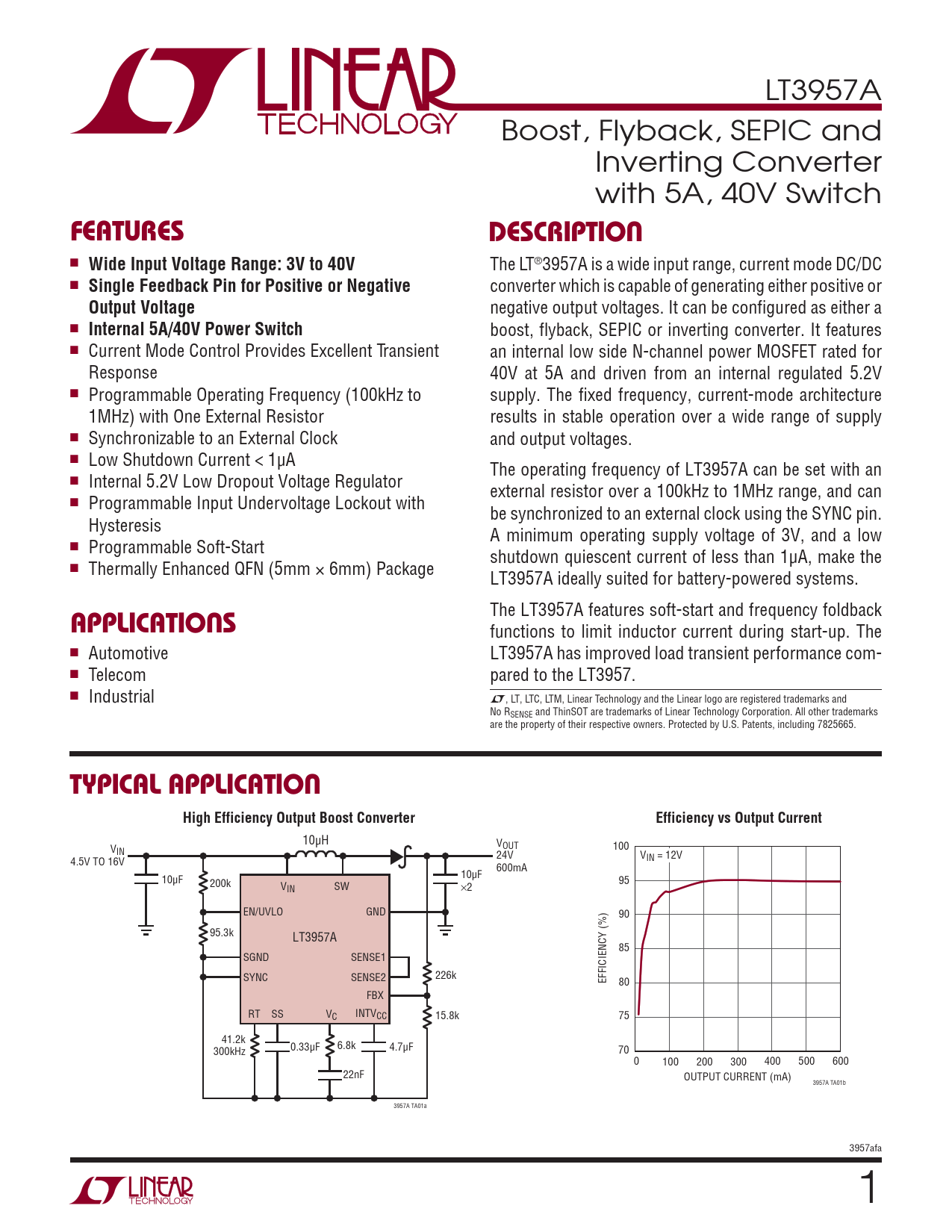LT3957A Boost, Flyback, SEPIC and Inverting Converter with 5A, 40V Switch