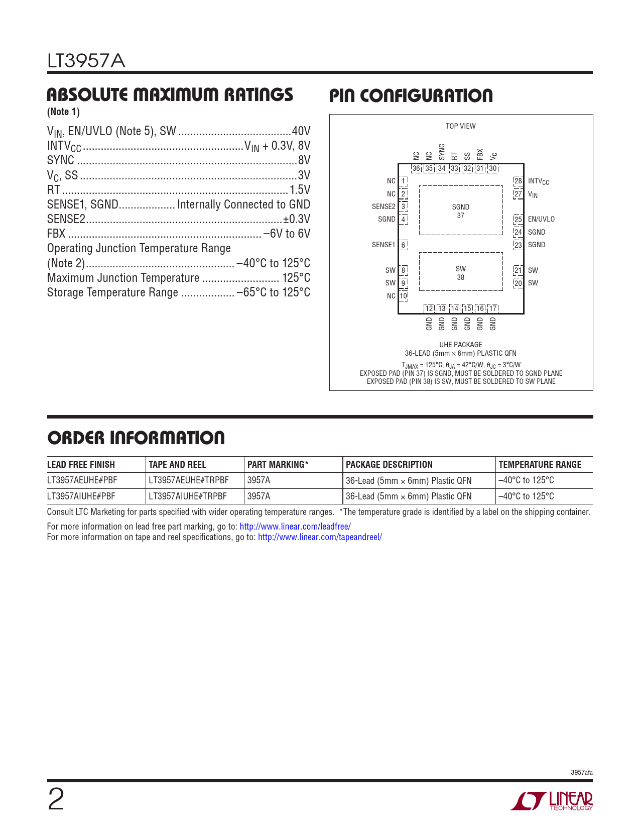LT3957A ABSOLUTE MAXIMUM RATINGSPIN CONFIGURATION(Note 1) V TOP VIEW IN, EN/UVLO (Note 5), SW ..40V INTVCC ..VIN + 0.3V, 8V C SYNC ..8V NC NC SYNC RT SS FBX V 36 35 34 33 32 31 30 VC, SS ...3V NC 1 28 INTVCC RT ..1.5V NC 2 27 VIN SENSE1, SGND... Internally Connected to GND SENSE2 3 SGND SENSE2 ..±0.3V 37 SGND 4 25 EN/UVLO FBX ... –6V to 6V 24 SGND Operating Junction Temperature Range SENSE1 6 23 SGND (Note 2) .. –40°C to 125°C SW SW 8 21 SW Maximum Junction Temperature .. 125°C 38 SW 9 20 SW Storage Temperature Range .. –65°C to 125°C NC 10 12 13 14 15 16 17 GND GND GND GND GND GND UHE PACKAGE 36-LEAD (5mm w 6mm) PLASTIC QFN TJMAX = 125°C, θJA = 42°C/W, θJC = 3°C/W EXPOSED PAD (PIN 37) IS SGND, MUST BE SOLDERED TO SGND PLANE EXPOSED PAD (PIN 38) IS SW, MUST BE SOLDERED TO SW PLANE ORDER INFORMATIONLEAD FREE FINISHTAPE AND REELPART MARKING*PACKAGE DESCRIPTIONTEMPERATURE RANGE LT3957AEUHE#PBF LT3957AEUHE#TRPBF 3957A 36-Lead (5mm × 6mm) Plastic QFN –40°C to 125°C LT3957AIUHE#PBF LT3957AIUHE#TRPBF 3957A 36-Lead (5mm × 6mm) Plastic QFN –40°C to 125°C Consult LTC Marketing for parts specified with wider operating temperature ranges. *The temperature grade is identified by a label on the shipping container. For more information on lead free part marking, go to: http://www.linear.com/leadfree/ For more information on tape and reel specifications, go to: http://www.linear.com/tapeandreel/ 3957afa 2