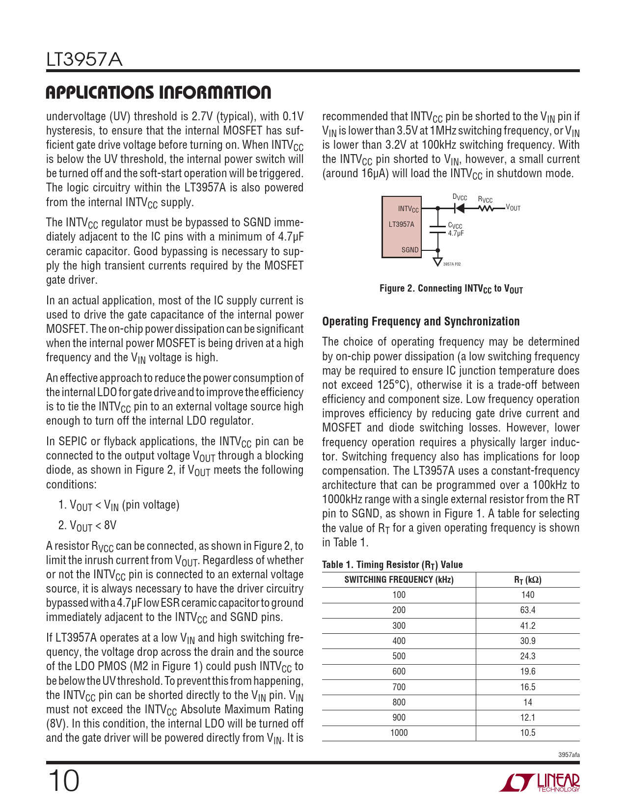 LT3957A APPLICATIONS INFORMATION undervoltage (UV) threshold is 2.7V (typical), with 0.1V recommended that INTVCC pin be shorted to the VIN pin if hysteresis, to ensure that the internal MOSFET has suf- VIN is lower than 3.5V at 1MHz switching frequency, or VIN ficient gate drive voltage before turning on. When INTVCC is lower than 3.2V at 100kHz switching frequency. With is below the UV threshold, the internal power switch will the INTVCC pin shorted to VIN, however, a small current be turned off and the soft-start operation will be triggered. (around 16μA) will load the INTVCC in shutdown mode. The logic circuitry within the LT3957A is also powered D from the internal INTV VCC RVCC CC supply. V INTV OUT CC The INTVCC regulator must be bypassed to SGND imme- LT3957A CVCC diately adjacent to the IC pins with a minimum of 4.7μF 4.7μF ceramic capacitor. Good bypassing is necessary to sup- SGND ply the high transient currents required by the MOSFET 3957A F02 gate driver. Figure 2. Connecting INTVCC to VOUT In an actual application, most of the IC supply current is used to drive the gate capacitance of the internal power Operating Frequency and Synchronization MOSFET. The on-chip power dissipation can be significant when the internal power MOSFET is being driven at a high The choice of operating frequency may be determined frequency and the VIN voltage is high. by on-chip power dissipation (a low switching frequency may be required to ensure IC junction temperature does An effective approach to reduce the power consumption of not exceed 125°C), otherwise it is a trade-off between the internal LDO for gate drive and to improve the efficiency efficiency and component size. Low frequency operation is to tie the INTVCC pin to an external voltage source high improves efficiency by reducing gate drive current and enough to turn off the internal LDO regulator. MOSFET and diode switching losses. However, lower In SEPIC or flyback applications, the INTVCC pin can be frequency operation requires a physically larger induc- connected to the output voltage VOUT through a blocking tor. Switching frequency also has implications for loop diode, as shown in Figure 2, if VOUT meets the following compensation. The LT3957A uses a constant-frequency conditions: architecture that can be programmed over a 100kHz to 1. V 1000kHz range with a single external resistor from the RT OUT < VIN (pin voltage) pin to SGND, as shown in Figure 1. A table for selecting 2. VOUT < 8V the value of RT for a given operating frequency is shown A resistor R in Table 1. VCC can be connected, as shown in Figure 2, to limit the inrush current from VOUT. Regardless of whether Table 1. Timing Resistor (RT) Value or not the INTVCC pin is connected to an external voltage SWITCHING FREQUENCY (kHz)RT (kΩ) source, it is always necessary to have the driver circuitry 100 140 bypassed with a 4.7μF low ESR ceramic capacitor to ground 200 63.4 immediately adjacent to the INTVCC and SGND pins. 300 41.2 If LT3957A operates at a low VIN and high switching fre- 400 30.9 quency, the voltage drop across the drain and the source 500 24.3 of the LDO PMOS (M2 in Figure 1) could push INTVCC to 600 19.6 be below the UV threshold. To prevent this from happening, 700 16.5 the INTVCC pin can be shorted directly to the VIN pin. VIN 800 14 must not exceed the INTVCC Absolute Maximum Rating 900 12.1 (8V). In this condition, the internal LDO will be turned off and the gate driver will be powered directly from V 1000 10.5 IN. It is 3957afa 10