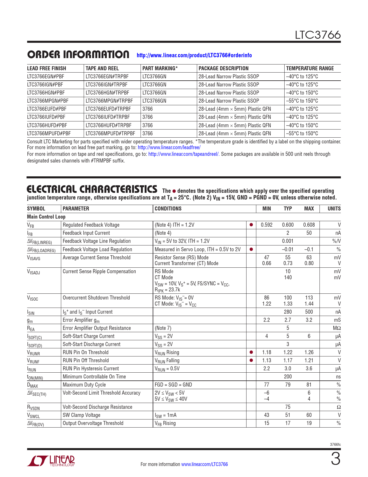 LTC3766EGN#PBF LTC3766EGN#TRPBF LTC3766GN 28-Lead Narrow Plastic SSOP –40°C to 125°C LTC3766IGN#PBF LTC3766IGN#TRPBF LTC3766GN 28-Lead Narrow Plastic SSOP –40°C to 125°C LTC3766HGN#PBF LTC3766HGN#TRPBF LTC3766GN 28-Lead Narrow Plastic SSOP –40°C to 150°C LTC3766MPGN#PBF LTC3766MPGN#TRPBF LTC3766GN 28-Lead Narrow Plastic SSOP –55°C to 150°C LTC3766EUFD#PBF LTC3766EUFD#TRPBF 3766 28-Lead (4mm × 5mm) Plastic QFN –40°C to 125°C LTC3766IUFD#PBF LTC3766IUFD#TRPBF 3766 28-Lead (4mm × 5mm) Plastic QFN –40°C to 125°C LTC3766HUFD#PBF LTC3766HUFD#TRPBF 3766 28-Lead (4mm × 5mm) Plastic QFN –40°C to 150°C LTC3766MPUFD#PBF LTC3766MPUFD#TRPBF 3766 28-Lead (4mm × 5mm) Plastic QFN –55°C to 150°C Consult LTC Marketing for parts specified with wider operating temperature ranges. *The temperature grade is identified by a label on the shipping container. For more information on lead free part marking, go to: http://www.linear.com/leadfree/ For more information on tape and reel specifications, go to: http://www.linear.com/tapeandreel/. Some packages are available in 500 unit reels through designated sales channels with #TRMPBF suffix.