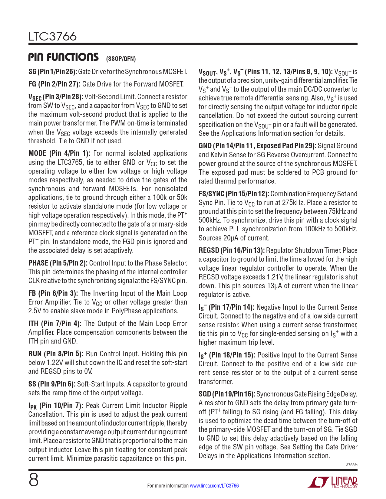 Peak Current Limit Inductor Ripple Cancellation. This pin is used to adjust the peak current off (PT+ falling) to SG rising (and FG falling). This delay limit based on the amount of inductor current ripple, thereby is used to optimize the dead time between the turn-off of providing a constant average output current during current the primary-side MOSFET and the turn-on of SG. Tie SGD limit. Place a resistor to GND that is proportional to the main to GND to set this delay adaptively based on the falling output inductor. Leave this pin floating for constant peak edge of the SW pin voltage. See Setting the Gate Driver current limit. Minimize parasitic capacitance on this pin. Delays in the Applications Information section. 3766fc 8 For more information www.linear.com/LTC3766 Document Outline Features Applications Description Typical Application Absolute Maximum Ratings Pin Configuration Order Information Electrical Characteristics Typical Performance Characteristics Pin Functions Block Diagram Timing Diagram Operation Applications Information Typical Applications Package Description Typical Application Related Parts Features Applications Typical Application Description Absolute Maximum Ratings Pin Configuration Order Information Electrical Characteristics Typical Performance Characteristics Pin Functions Block Diagram Timing Diagram Operation Applications Information Typical Applications Typical Applications Typical Applications Package Description Revision History Typical Application Related Parts