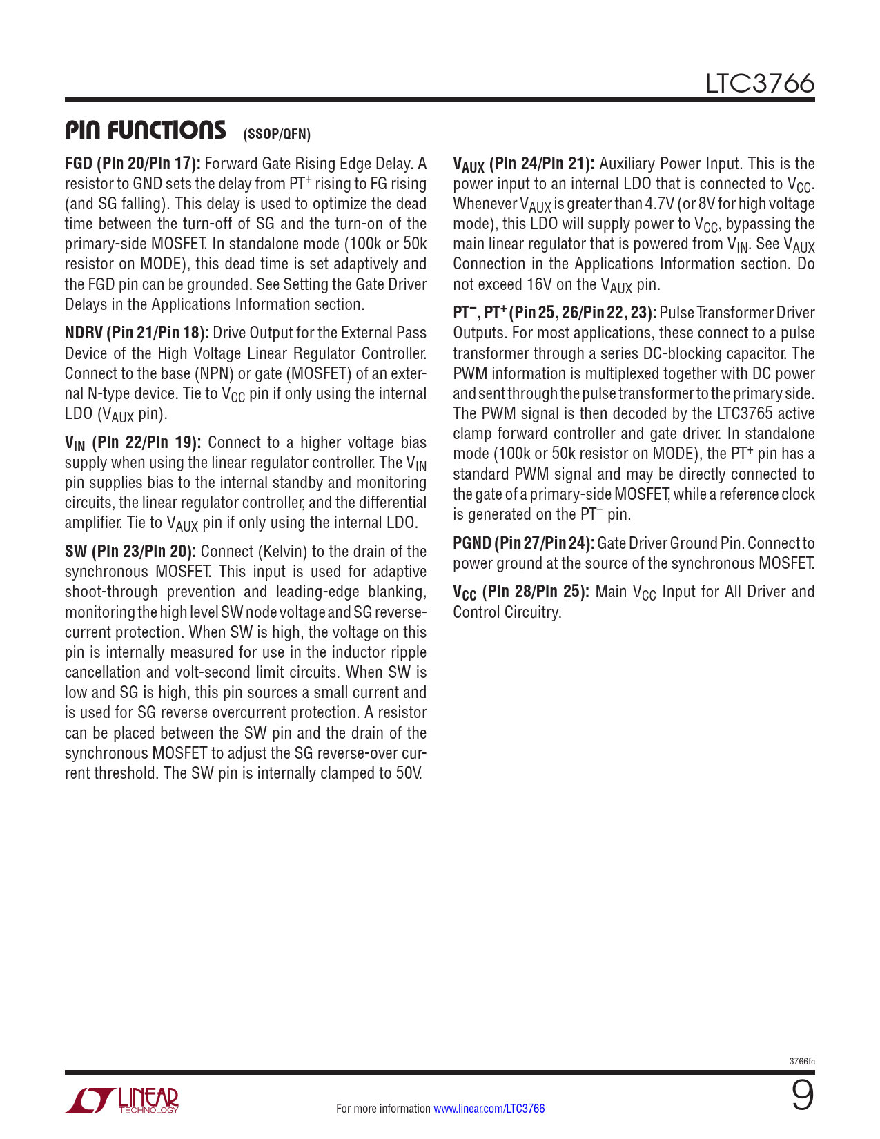 LTC3766 PIN FUNCTIONS (SSOP/QFN) FGD (Pin 20/Pin 17): Forward Gate Rising Edge Delay. A VAUX (Pin 24/Pin 21): Auxiliary Power Input. This is the resistor to GND sets the delay from PT+ rising to FG rising power input to an internal LDO that is connected to VCC. (and SG falling). This delay is used to optimize the dead Whenever VAUX is greater than 4.7V (or 8V for high voltage time between the turn-off of SG and the turn-on of the mode), this LDO will supply power to VCC, bypassing the primary-side MOSFET. In standalone mode (100k or 50k main linear regulator that is powered from VIN. See VAUX resistor on MODE), this dead time is set adaptively and Connection in the Applications Information section. Do the FGD pin can be grounded. See Setting the Gate Driver not exceed 16V on the VAUX pin. Delays in the Applications Information section. PT –, PT+ (Pin 25, 26/Pin 22, 23): Pulse Transformer Driver NDRV (Pin 21/Pin 18): Drive Output for the External Pass Outputs. For most applications, these connect to a pulse Device of the High Voltage Linear Regulator Controller. transformer through a series DC-blocking capacitor. The Connect to the base (NPN) or gate (MOSFET) of an exter- PWM information is multiplexed together with DC power nal N-type device. Tie to VCC pin if only using the internal and sent through the pulse transformer to the primary side. LDO (VAUX pin). The PWM signal is then decoded by the LTC3765 active V clamp forward controller and gate driver. In standalone IN (Pin 22/Pin 19): Connect to a higher voltage bias supply when using the linear regulator controller. The V mode (100k or 50k resistor on MODE), the PT+ pin has a IN pin supplies bias to the internal standby and monitoring standard PWM signal and may be directly connected to circuits, the linear regulator controller, and the differential the gate of a primary-side MOSFET, while a reference clock amplifier. Tie to V is generated on the PT– pin. AUX pin if only using the internal LDO. SW (Pin 23/Pin 20): Connect (Kelvin) to the drain of the PGND (Pin 27/Pin 24): Gate Driver Ground Pin. Connect to synchronous MOSFET. This input is used for adaptive power ground at the source of the synchronous MOSFET. shoot-through prevention and leading-edge blanking, VCC (Pin 28/Pin 25): Main VCC Input for All Driver and monitoring the high level SW node voltage and SG reverse- Control Circuitry. current protection. When SW is high, the voltage on this pin is internally measured for use in the inductor ripple cancellation and volt-second limit circuits. When SW is low and SG is high, this pin sources a small current and is used for SG reverse overcurrent protection. A resistor can be placed between the SW pin and the drain of the synchronous MOSFET to adjust the SG reverse-over cur- rent threshold. The SW pin is internally clamped to 50V. 3766fc For more information www.linear.com/LTC3766 9 Document Outline Features Applications Description Typical Application Absolute Maximum Ratings Pin Configuration Order Information Electrical Characteristics Typical Performance Characteristics Pin Functions Block Diagram Timing Diagram Operation Applications Information Typical Applications Package Description Typical Application Related Parts Features Applications Typical Application Description Absolute Maximum Ratings Pin Configuration Order Information Electrical Characteristics Typical Performance Characteristics Pin Functions Block Diagram Timing Diagram Operation Applications Information Typical Applications Typical Applications Typical Applications Package Description Revision History Typical Application Related Parts