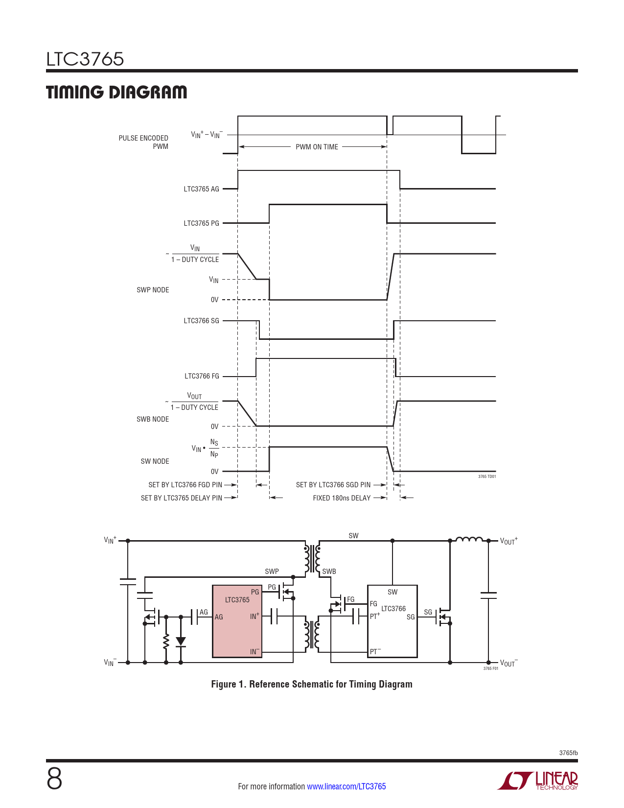 V + – IN – VIN PULSE ENCODED PWM PWM ON TIME LTC3765 AG LTC3765 PG VIN ~ 1 – DUTY CYCLE VIN SWP NODE 0V LTC3766 SG LTC3766 FG VOUT ~ 1 – DUTY CYCLE SWB NODE 0V N V S IN • NP SW NODE 0V 3765 TD01 SET BY LTC3766 FGD PIN SET BY LTC3766 SGD PIN SET BY LTC3765 DELAY PIN FIXED 180ns DELAY V + SW IN V + OUT • • SWP SWB PG PG SW LTC3765 FG FG AG LTC3766 SG AG IN+ PT+ SG • • IN– PT– V – IN V – OUT 3765 F01