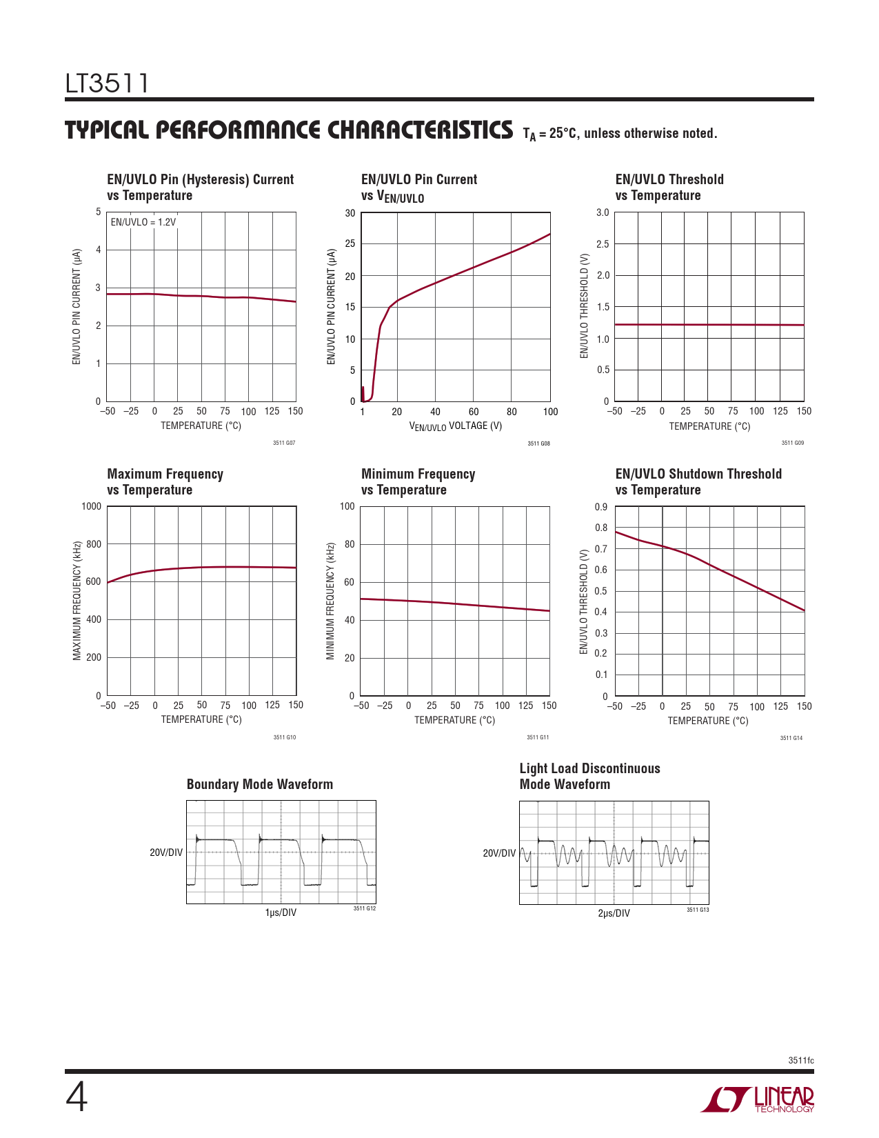 5 30 3.0 EN/UVLO = 1.2V 25 2.5 4 20 2.0 3 15 1.5 2 10 1.0 EN/UVLO THRESHOLD (V) EN/UVLO PIN CURRENT (μA) 1 EN/UVLO PIN CURRENT (μA) 5 0.5 0 0 0 –50 –25 0 25 50 75 100 5 2 1 0 5 1 1 20 40 60 80 100 –50 –25 0 25 0 5 75 0 0 1 5 2 1 0 5 1 TEMPERATURE (°C) VEN/UVLO VOLTAGE (V) TEMPERATURE (°C) 3511 G07 3511 G08 3511 G09
