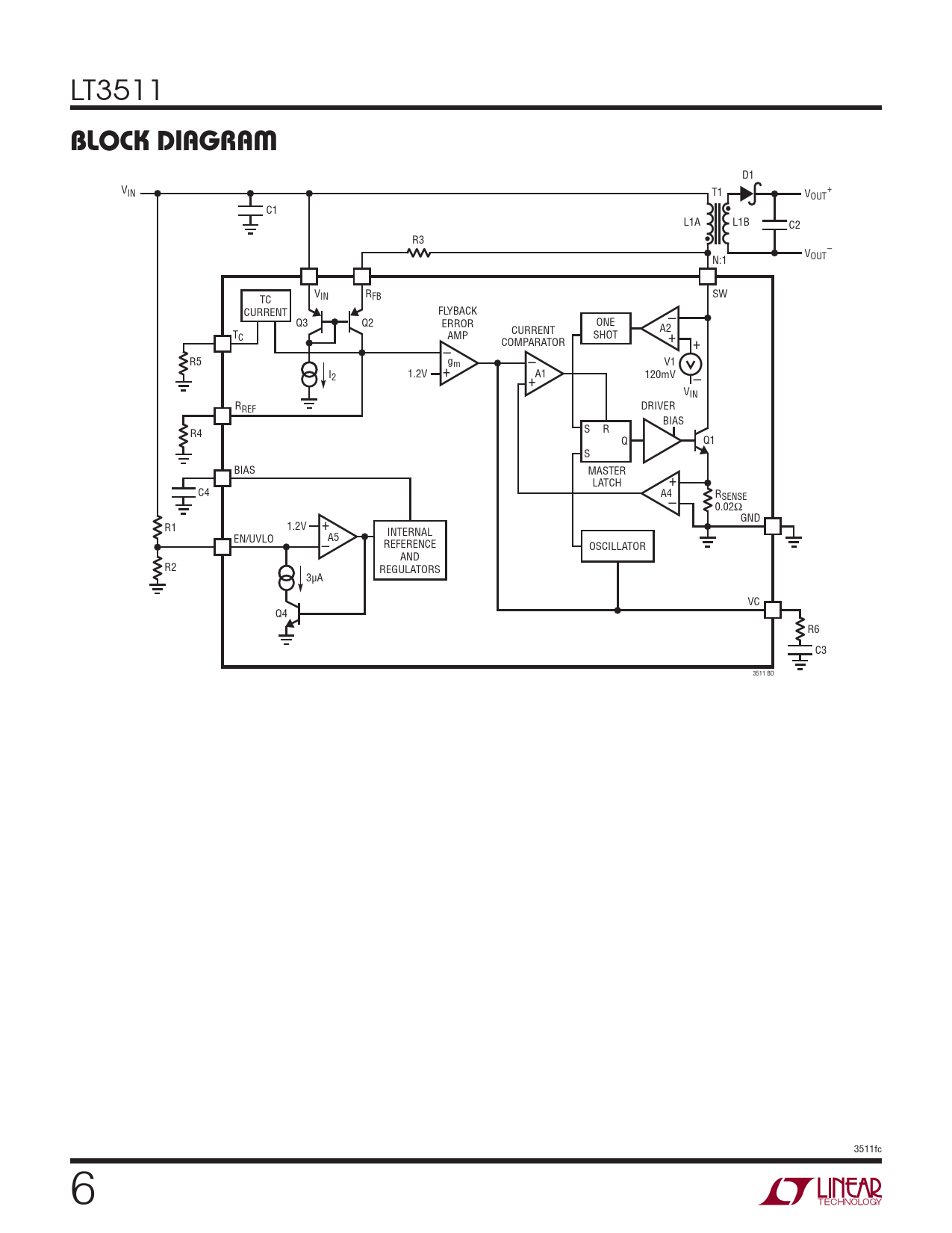 D1 VIN T1 V + OUT C1 L1A L1B C2 R3 V – OUT N:1 VIN R SW TC FB CURRENT FLYBACK Q3 Q2 ERROR ONE – CURRENT A2 TC AMP SHOT COMPARATOR + + – R5 gm V1 – I 1.2V + A1 120mV 2 + – VIN R DRIVER REF BIAS R4 S R Q Q1 S BIAS MASTER LATCH + C4 A4 RSENSE – 0.02Ω GND R1 1.2V + INTERNAL EN/UVLO A5 REFERENCE – OSCILLATOR AND R2 REGULATORS 3μA VC Q4 R6 C3 3511 BD 3511fc 6