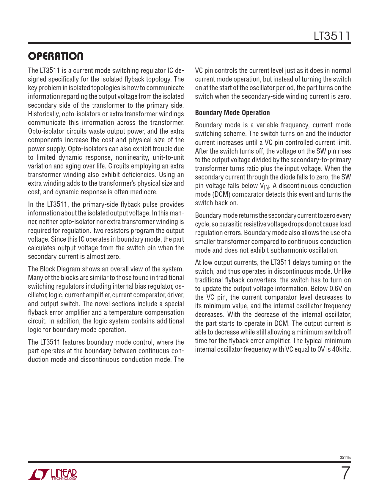 The LT3511 is a current mode switching regulator IC de- VC pin controls the current level just as it does in normal signed specifically for the isolated flyback topology. The current mode operation, but instead of turning the switch key problem in isolated topologies is how to communicate on at the start of the oscillator period, the part turns on the information regarding the output voltage from the isolated switch when the secondary-side winding current is zero. secondary side of the transformer to the primary side. Historically, opto-isolators or extra transformer windings