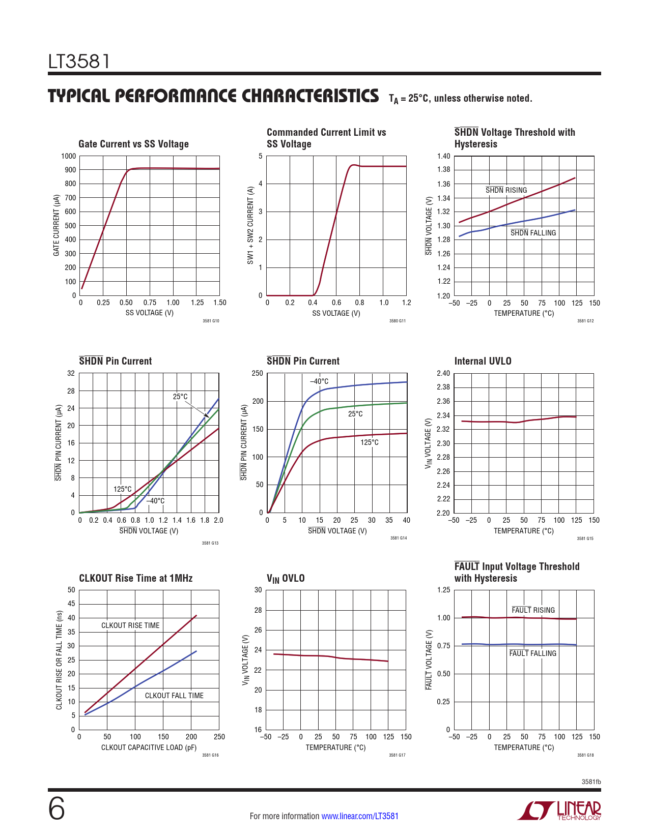 1000 5 1.40 900 1.38 800 4 1.36 SHDN RISING 700 1.34 600 3 1.32 500 1.30 VOLTAGE (V) SHDN FALLING 400 2 1.28 TE CURRENT (µA) GA 300 SHDN 1.26 SW1 + SW2 CURRENT (A) 200 1 1.24 100 1.22 0 0 1.20 0 0.25 0.50 0.75 1.00 1.25 1.50 0 0.2 0.4 0.6 0.8 1.0 1.2 –50 –25 0 25 50 75 100 125 150 SS VOLTAGE (V) SS VOLTAGE (V) TEMPERATURE (°C) 3581 G10 3580 G11 3581 G12