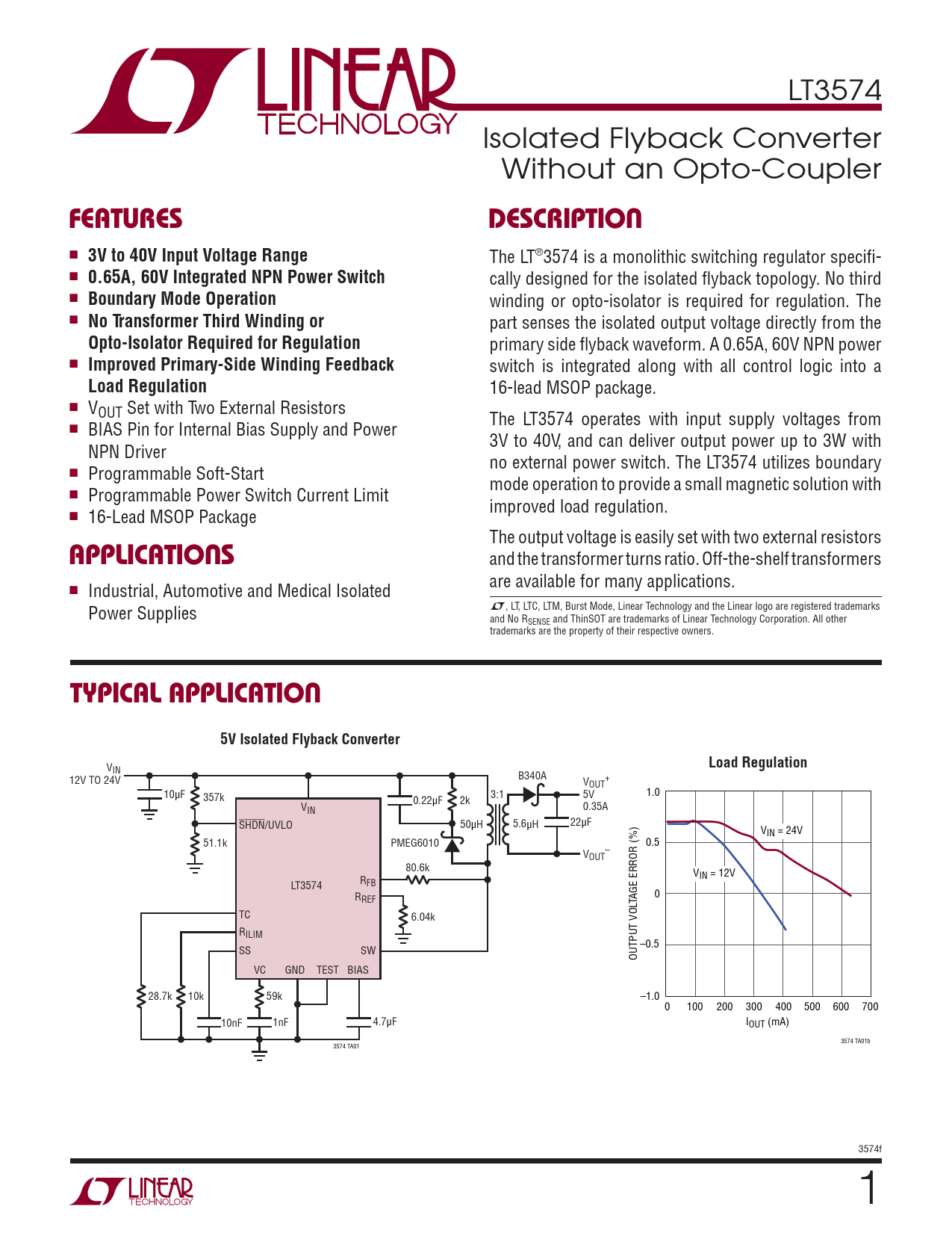 LT3574 Isolated Flyback Converter Without an Opto-Coupler Features Description n 3V to 40V Input Voltage Range The LT®3574 is a monolithic switching regulator specifi- n 0.65A, 60V Integrated NPN Power Switch cally designed for the isolated flyback topology. No third n Boundary Mode Operation winding or opto-isolator is required for regulation. The n No Transformer Third Winding or part senses the isolated output voltage directly from the Opto-Isolator Required for Regulation primary side flyback waveform. A 0.65A, 60V NPN power n Improved Primary-Side Winding Feedback switch is integrated along with all control logic into a Load Regulation 16-lead MSOP package. n VOUT Set with Two External Resistors The LT3574 operates with input supply voltages from n BIAS Pin for Internal Bias Supply and Power 3V to 40V, and can deliver output power up to 3W with NPN Driver no external power switch. The LT3574 utilizes boundary n Programmable Soft-Start mode operation to provide a small magnetic solution with n Programmable Power Switch Current Limit improved load regulation. n 16-Lead MSOP Package The output voltage is easily set with two external resistors applications and the transformer turns ratio. Off-the-shelf transformers are available for many applications. n Industrial, Automotive and Medical Isolated Power Supplies L, LT, LTC, LTM, Burst Mode, Linear Technology and the Linear logo are registered trademarks and No RSENSE and ThinSOT are trademarks of Linear Technology Corporation. All other trademarks are the property of their respective owners. typical application 5V Isolated Flyback Converter V Load Regulation IN 12V TO 24V B340A V + OUT 10µF 3:1 5V 357k 1.0 0.22µF 2k V 0.35A IN • SHDN/UVLO 50µH 5.6µH 22µF VIN = 24V 51.1k PMEG6010 • 0.5 V – OUT 80.6k V R IN = 12V FB LT3574 R 0 REF TAGE ERROR (%) TC 6.04k RILIM SS –0.5 SW OUTPUT VOL VC GND TEST BIAS 28.7k 10k 59k –1.0 0 100 200 300 400 500 600 700 10nF 1nF 4.7µF IOUT (mA) 3574 TA01b 3574 TA01 3574f Document Outline Features Applications Description Typical Application Absolute Maximum Ratings Pin Configuration order information Electrical Characteristics Typical Performance Characteristics Pin Functions block diagram Operation Applications Information typical Applications Package Description Typical Application Related Parts
