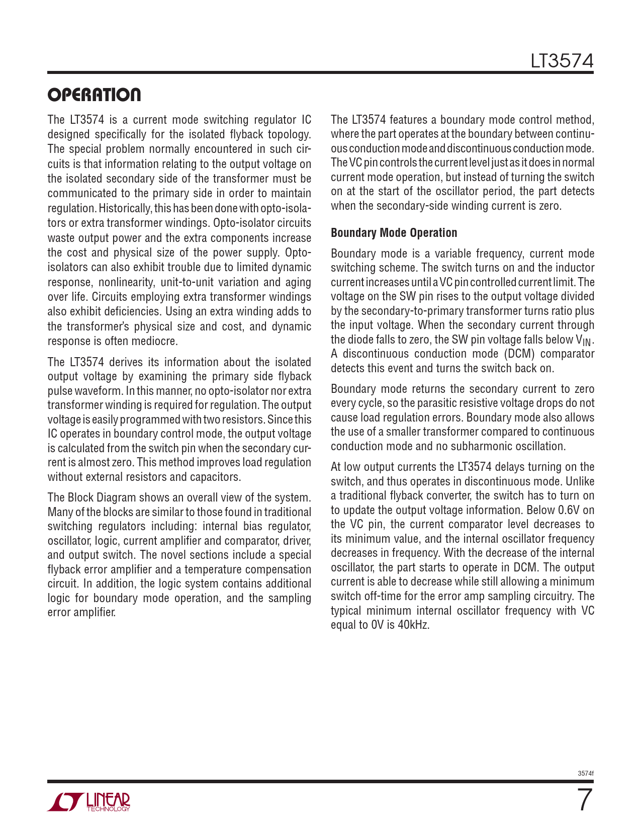 LT3574 operation The LT3574 is a current mode switching regulator IC The LT3574 features a boundary mode control method, designed specifically for the isolated flyback topology. where the part operates at the boundary between continu- The special problem normally encountered in such cir- ous conduction mode and discontinuous conduction mode. cuits is that information relating to the output voltage on The VC pin controls the current level just as it does in normal the isolated secondary side of the transformer must be current mode operation, but instead of turning the switch communicated to the primary side in order to maintain on at the start of the oscillator period, the part detects regulation. Historical y, this has been done with opto-isola- when the secondary-side winding current is zero. tors or extra transformer windings. Opto-isolator circuits waste output power and the extra components increase