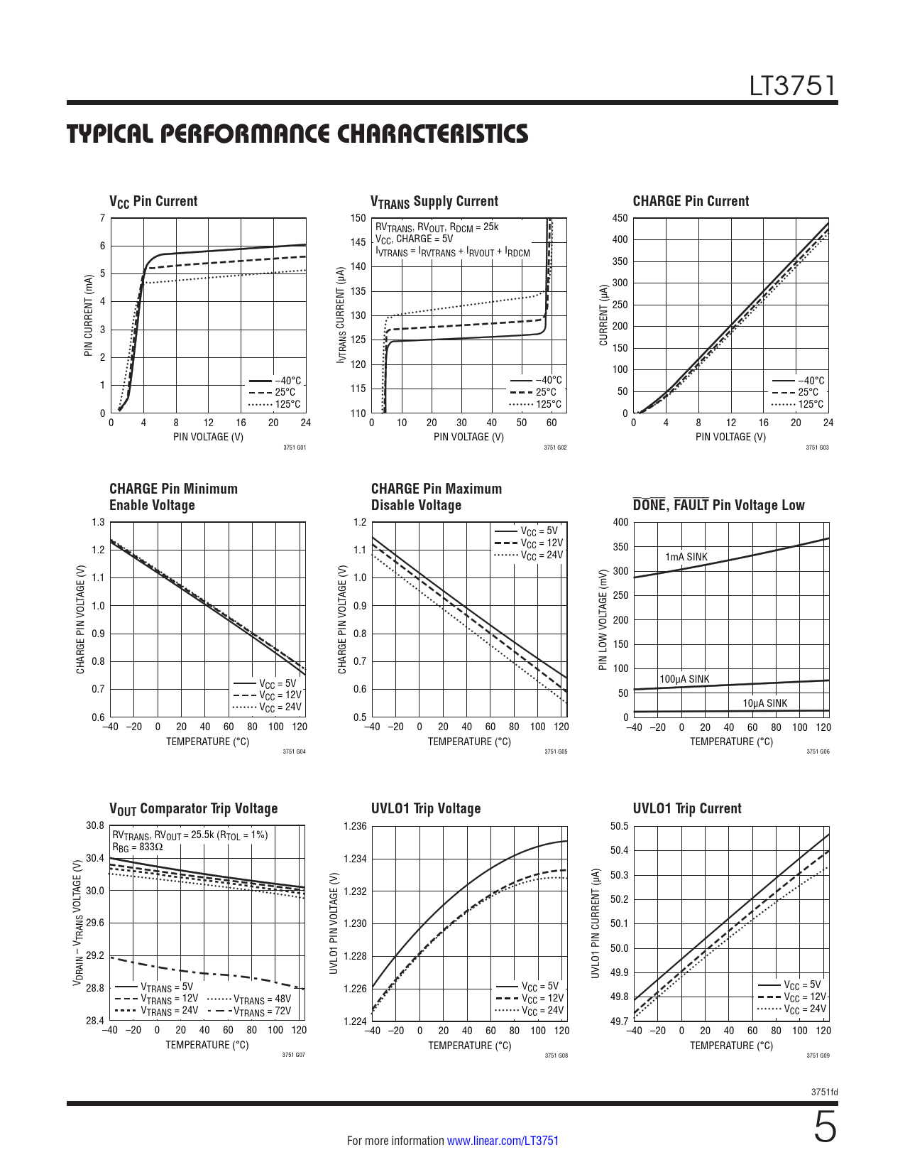 7 150 450 RVTRANS, RVOUT, RDCM = 25k V 6 145 CC, CHARGE = 5V 400 IVTRANS = IRVTRANS + IRVOUT + IRDCM 140 350 5 300 135 4 250 130 3 CURRENT (µA) 200 125 CURRENT (µA) PIN CURRENT (mA) 150 2 I VTRANS 120 100 1 –40°C –40°C –40°C 25°C 115 25°C 50 25°C 125°C 125°C 125°C 0 110 0 0 4 8 12 16 20 24 0 10 20 30 40 50 60 0 4 8 12 16 20 24 PIN VOLTAGE (V) PIN VOLTAGE (V) PIN VOLTAGE (V) 3751 G01 3751 G02 3751 G03