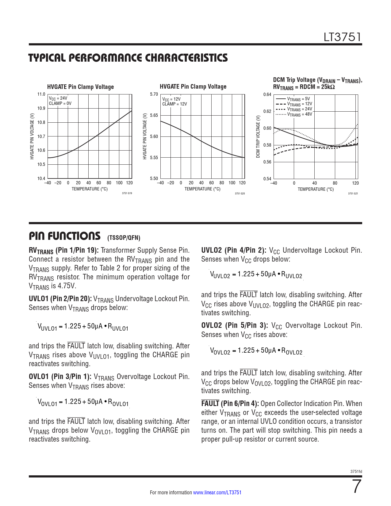 11.0 5.70 0.64 VCC = 24V VCC = 12V VTRANS = 5V CLAMP = 0V CLAMP = 12V VTRANS = 12V 10.9 0.62 VTRANS = 24V 5.65 VTRANS = 48V 10.8 TAGE (V) TAGE (V) TAGE (V) 0.60 10.7 5.60 TE PIN VOL 0.58 10.6 TE PIN VOL HVGA HVGA 5.55 DCM TRIP VOL 10.5 0.56 10.4 5.50 0.54 –40 –20 0 20 40 60 80 100 120 –40 –20 0 20 40 60 80 100 120 –40 0 40 80 120 TEMPERATURE (°C) TEMPERATURE (°C) TEMPERATURE (°C) 3751 G19 3751 G20 3751 G21