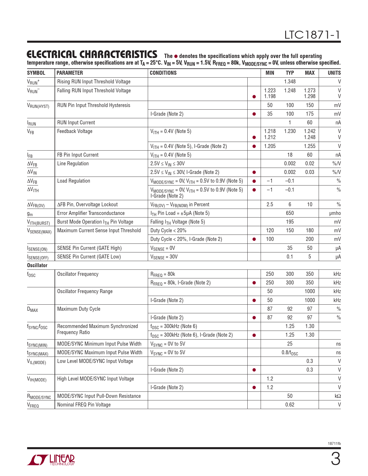 V + RUN Rising RUN Input Threshold Voltage 1.348 V V – RUN Falling RUN Input Threshold Voltage 1.223 1.248 1.273 V ● 1.198 1.298 V VRUN(HYST) RUN Pin Input Threshold Hysteresis 50 100 150 mV I-Grade (Note 2) ● 35 100 175 mV IRUN RUN Input Current 1 60 nA VFB Feedback Voltage VITH = 0.4V (Note 5) 1.218 1.230 1.242 V ● 1.212 1.248 V VITH = 0.4V (Note 5), I-Grade (Note 2) ● 1.205 1.255 V IFB FB Pin Input Current VITH = 0.4V (Note 5) 18 60 nA ΔVFB Line Regulation 2.5V ≤ VIN ≤ 30V 0.002 0.02 %/V ΔVIN 2.5V ≤ VIN ≤ 30V, I-Grade (Note 2) ● 0.002 0.03 %/V ΔVFB Load Regulation VMODE/SYNC = 0V, VITH = 0.5V to 0.9V (Note 5) ● – 1 –0.1 % ΔVITH VMODE/SYNC = 0V, VITH = 0.5V to 0.9V (Note 5) ● – 1 –0.1 % I-Grade (Note 2) ΔVFB(OV) ΔFB Pin, Overvoltage Lockout VFB(OV) – VFB(NOM) in Percent 2.5 6 10 % gm Error Amplifi er Transconductance ITH Pin Load = ±5μA (Note 5) 650 μmho VITH(BURST) Burst Mode Operation ITH Pin Voltage Falling ITH Voltage (Note 5) 195 mV VSENSE(MAX) Maximum Current Sense Input Threshold Duty Cycle < 20% 120 150 180 mV Duty Cycle < 20%, I-Grade (Note 2) ● 100 200 mV ISENSE(ON) SENSE Pin Current (GATE High) VSENSE = 0V 35 50 μA ISENSE(OFF) SENSE Pin Current (GATE Low) VSENSE = 30V 0.1 5 μA