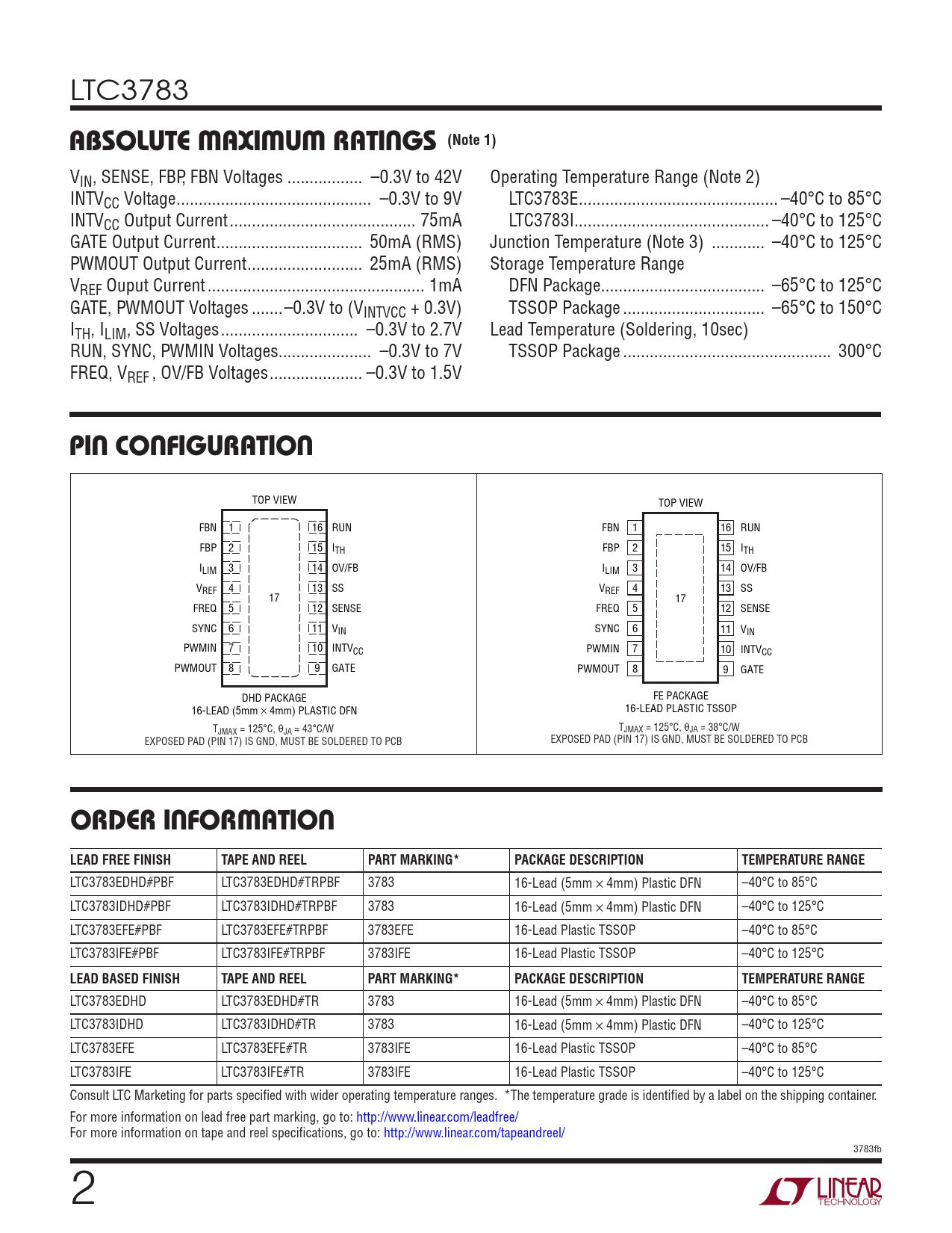 LTC3783EDHD#PBF LTC3783EDHD#TRPBF 3783 16-Lead (5mm × 4mm) Plastic DFN –40°C to 85°C LTC3783IDHD#PBF LTC3783IDHD#TRPBF 3783 16-Lead (5mm × 4mm) Plastic DFN –40°C to 125°C LTC3783EFE#PBF LTC3783EFE#TRPBF 3783EFE 16-Lead Plastic TSSOP –40°C to 85°C LTC3783IFE#PBF LTC3783IFE#TRPBF 3783IFE 16-Lead Plastic TSSOP –40°C to 125°C