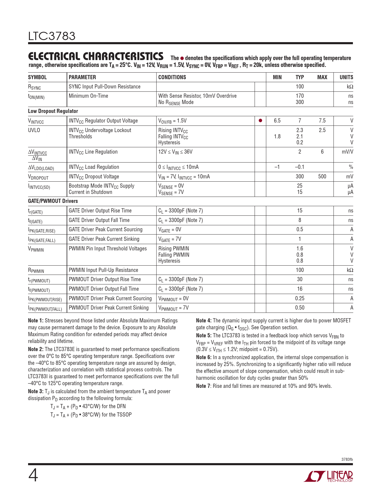 TJ is calculated from the ambient temperature TA and power dissipation PD according to the following formula: TJ = TA + (PD • 43°C/W) for the DFN TJ = TA + (PD • 38°C/W) for the TSSOP 3783fb 4 Document Outline Features Description Applications Typical Application Absolute Maximum Ratings Pin Configuration Order Information Electrical Characteristics Pin Functions Block Diagram Operation Package Description Related Parts