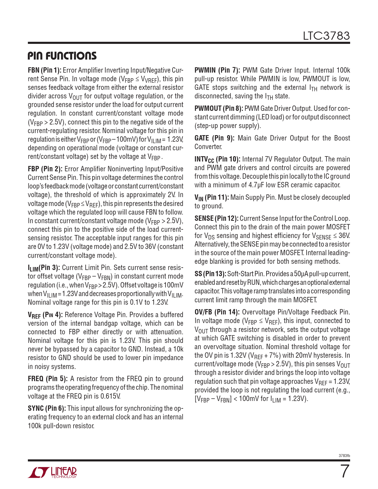 This input allows for synchronizing the op- erating frequency to an external clock and has an internal 100k pull-down resistor. 3783fb 7 Document Outline Features Description Applications Typical Application Absolute Maximum Ratings Pin Configuration Order Information Electrical Characteristics Pin Functions Block Diagram Operation Package Description Related Parts