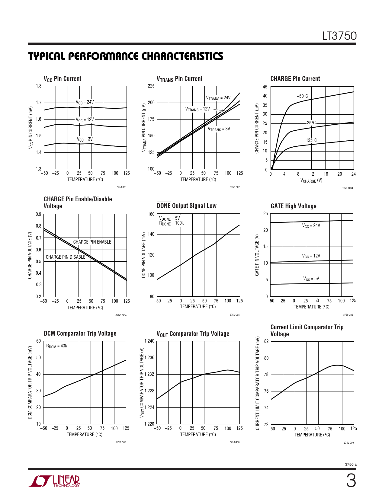 0.9 160 25 VDONE = 5V R 0.8 DONE = 100k VCC = 24V 20 140 0.7 CHARGE PIN ENABLE 15 0.6 120 CHARGE PIN DISABLE VCC = 12V 0.5 10 0.4 GATE PIN VOLTAGE (V) CHARGE PIN VOLTAGE (V) DONE PIN VOLTAGE (mV) 100 5 VCC = 5V 0.3 0.2 80 0 –50 –25 0 25 50 75 100 125 –50 –25 0 25 50 75 100 125 –50 –25 0 25 50 75 100 125 TEMPERATURE (°C) TEMPERATURE (°C) TEMPERATURE (°C) 3750 G04 3750 G05 3750 G06