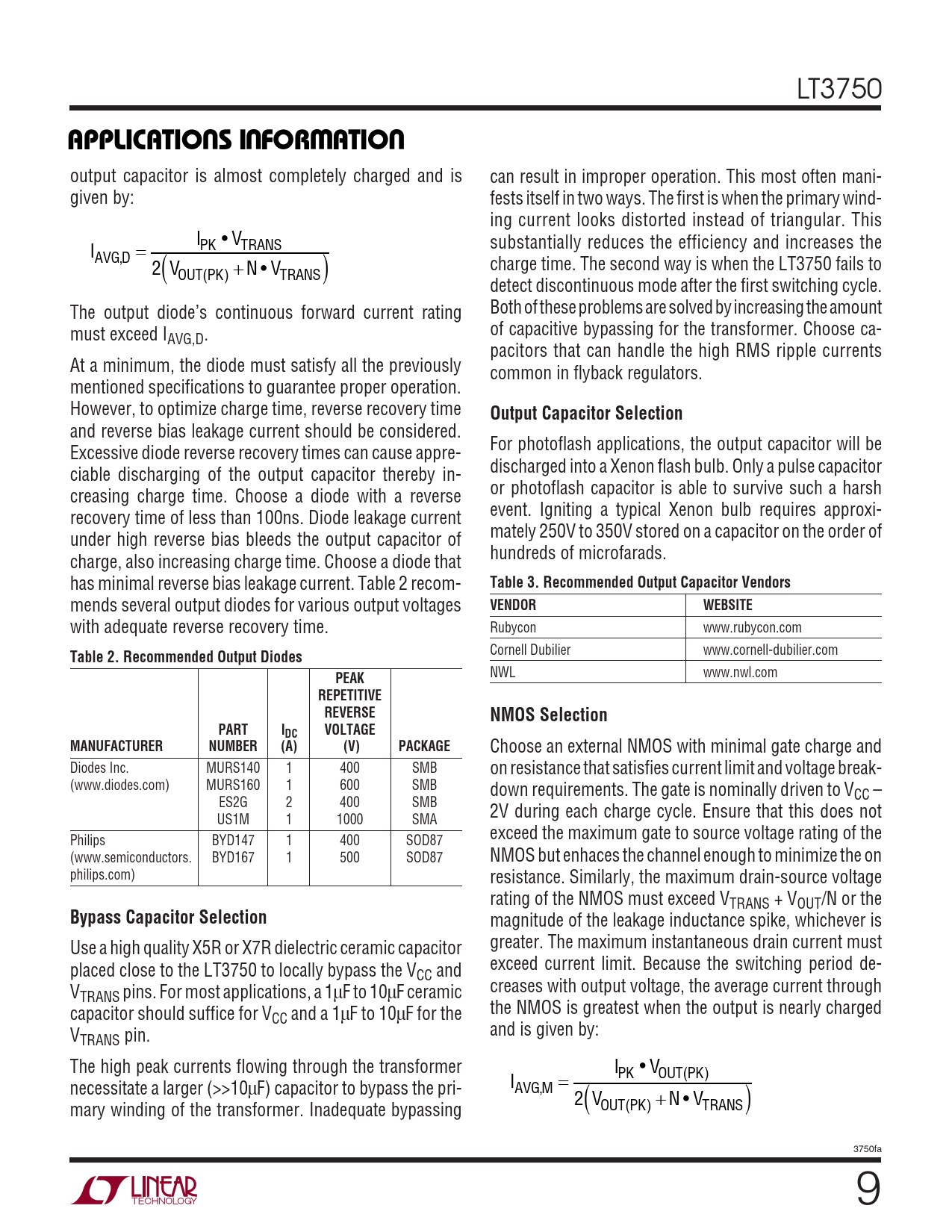 output capacitor is almost completely charged and is can result in improper operation. This most often mani- given by: fests itself in two ways. The first is when the primary wind- ing current looks distorted instead of triangular. This I • V substantially reduces the efficiency and increases the I PK TRANS = AVG D , 2 V ( + N • V ) charge time. The second way is when the LT3750 fails to OUT PK ( ) TRANS detect discontinuous mode after the first switching cycle. The output diode’s continuous forward current rating Both of these problems are solved by increasing the amount must exceed I of capacitive bypassing for the transformer. Choose ca- AVG,D. pacitors that can handle the high RMS ripple currents At a minimum, the diode must satisfy all the previously common in flyback regulators. mentioned specifications to guarantee proper operation. However, to optimize charge time, reverse recovery time