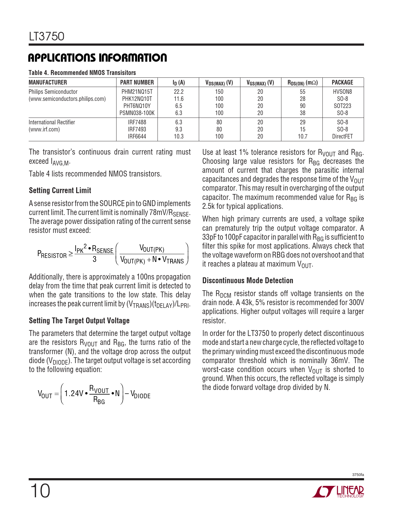 LT3750 UUWUAPPLICATIO S I FOR ATIOTable 4. Recommended NMOS TransisitorsMANUFACTURERPART NUMBERID (A)VDS(MAX) (V)VGS(MAX) (V)RDS(ON) (m Ω )PACKAGE Philips Semiconductor PHM21NQ15T 22.2 150 20 55 HVSON8 (www.semiconductors.philips.com) PHK12NQ10T 11.6 100 20 28 SO-8 PHT6NQ10Y 6.5 100 20 90 SOT223 PSMN038-100K 6.3 100 20 38 SO-8 International Rectifier IRF7488 6.3 80 20 29 SO-8 (www.irf.com) IRF7493 9.3 80 20 15 SO-8 IRF6644 10.3 100 20 10.7 DirectFET The transistor’s continuous drain current rating must Use at least 1% tolerance resistors for RVOUT and RBG. exceed IAVG,M. Choosing large value resistors for RBG decreases the amount of current that charges the parasitic internal Table 4 lists recommended NMOS transistors. capacitances and degrades the response time of the VOUT Setting Current Limit comparator. This may result in overcharging of the output capacitor. The maximum recommended value for RBG is A sense resistor from the SOURCE pin to GND implements 2.5k for typical applications. current limit. The current limit is nominally 78mV/RSENSE. The average power dissipation rating of the current sense When high primary currents are used, a voltage spike resistor must exceed: can prematurely trip the output voltage comparator. A 33pF to 100pF capacitor in parallel with RBG is sufficient to I 2 • R ⎛ V ⎞ filter this spike for most applications. Always check that ( ) P PK SENSE OUT PK RESISTOR ≥ ⎜ ⎟ the voltage waveform on RBG does not overshoot and that 3 V ⎝ ( ) + N • V OUT PK TR RANS ⎠ it reaches a plateau at maximum VOUT. Additionally, there is approximately a 100ns propagation Discontinuous Mode Detection delay from the time that peak current limit is detected to when the gate transitions to the low state. This delay The RDCM resistor stands off voltage transients on the increases the peak current limit by (V drain node. A 43k, 5% resistor is recommended for 300V TRANS)(tDELAY)/LPRI. applications. Higher output voltages will require a larger Setting The Target Output Voltage resistor. The parameters that determine the target output voltage In order for the LT3750 to properly detect discontinuous are the resistors RVOUT and RBG, the turns ratio of the mode and start a new charge cycle, the reflected voltage to transformer (N), and the voltage drop across the output the primary winding must exceed the discontinuous mode diode (VDIODE). The target output voltage is set according comparator threshold which is nominally 36mV. The to the following equation: worst-case condition occurs when VOUT is shorted to ground. When this occurs, the reflected voltage is simply ⎛ R ⎞ the diode forward voltage drop divided by N. V = 1.24V VOUT • • N – V OUT ⎝⎜ R DIODE BG ⎠⎟ 3750fa 10