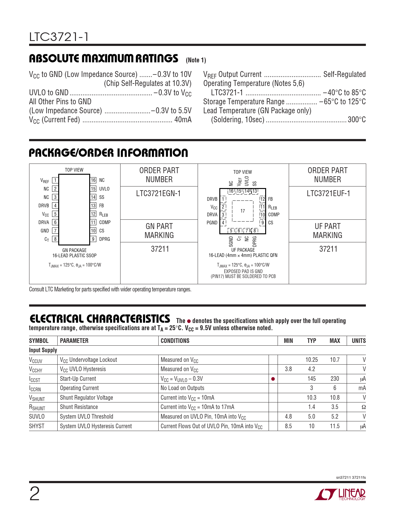 LTC3721-1 WWWUABSOLUTE AXI URATI GS (Note 1) VCC to GND (Low Impedance Source) ...– 0.3V to 10V VREF Output Current ... Self-Regulated (Chip Self-Regulates at 10.3V) Operating Temperature (Notes 5,6) UVLO to GND ... – 0.3V to VCC LTC3721-1 ... – 40°C to 85°C All Other Pins to GND Storage Temperature Range ... – 65°C to 125°C (Low Impedance Source) ...– 0.3V to 5.5V Lead Temperature (GN Package only) VCC (Current Fed) ... 40mA (Soldering, 10sec) .. 300°C UWUPACKAGE/ORDER I FOR ATIO TOP VIEW ORDER PART TOP VIEW ORDER PART V 1 16 REF NC NUMBER NUMBER REF NC V UVLO SS NC 2 15 UVLO LTC3721EGN-1 16 15 14 13 LTC3721EUF-1 NC 3 14 SS DRVB 1 12 FB DRVB 4 13 FB V 2 11 CC RLEB 17 V 5 12 CC RLEB DRVA 3 10 COMP DRVA 6 11 COMP PGND CS GN PART 4 9 UF PART GND 7 10 CS 5 6 7 8 MARKING T MARKING C 8 9 T DPRG C NC SGND DPRG GN PACKAGE 37211 UF PACKAGE 37211 16-LEAD PLASTIC SSOP 16-LEAD (4mm × 4mm) PLASTIC QFN TJMAX = 125°C, θJA = 100°C/W TJMAX = 125°C, θJA = 100°C/W EXPOSED PAD IS GND (PIN17) MUST BE SOLDERED TO PCB Consult LTC Marketing for parts specified with wider operating temperature ranges. ELECTRICAL CHARACTERISTICS The ● denotes the specifications which apply over the full operatingtemperature range, otherwise specifications are at TA = 25 ° C. VCC = 9.5V unless otherwise noted.SYMBOLPARAMETERCONDITIONSMINTYPMAXUNITSInput Supply VCCUV VCC Undervoltage Lockout Measured on VCC 10.25 10.7 V VCCHY VCC UVLO Hysteresis Measured on VCC 3.8 4.2 V ICCST Start-Up Current VCC = VUVLO – 0.3V ● 145 230 µA ICCRN Operating Current No Load on Outputs 3 6 mA VSHUNT Shunt Regulator Voltage Current into VCC = 10mA 10.3 10.8 V RSHUNT Shunt Resistance Current into VCC = 10mA to 17mA 1.4 3.5 Ω SUVLO System UVLO Threshold Measured on UVLO Pin, 10mA into VCC 4.8 5.0 5.2 V SHYST System UVLO Hysteresis Current Current Flows Out of UVLO Pin, 10mA into VCC 8.5 10 11.5 µA sn37211 37211fs 2