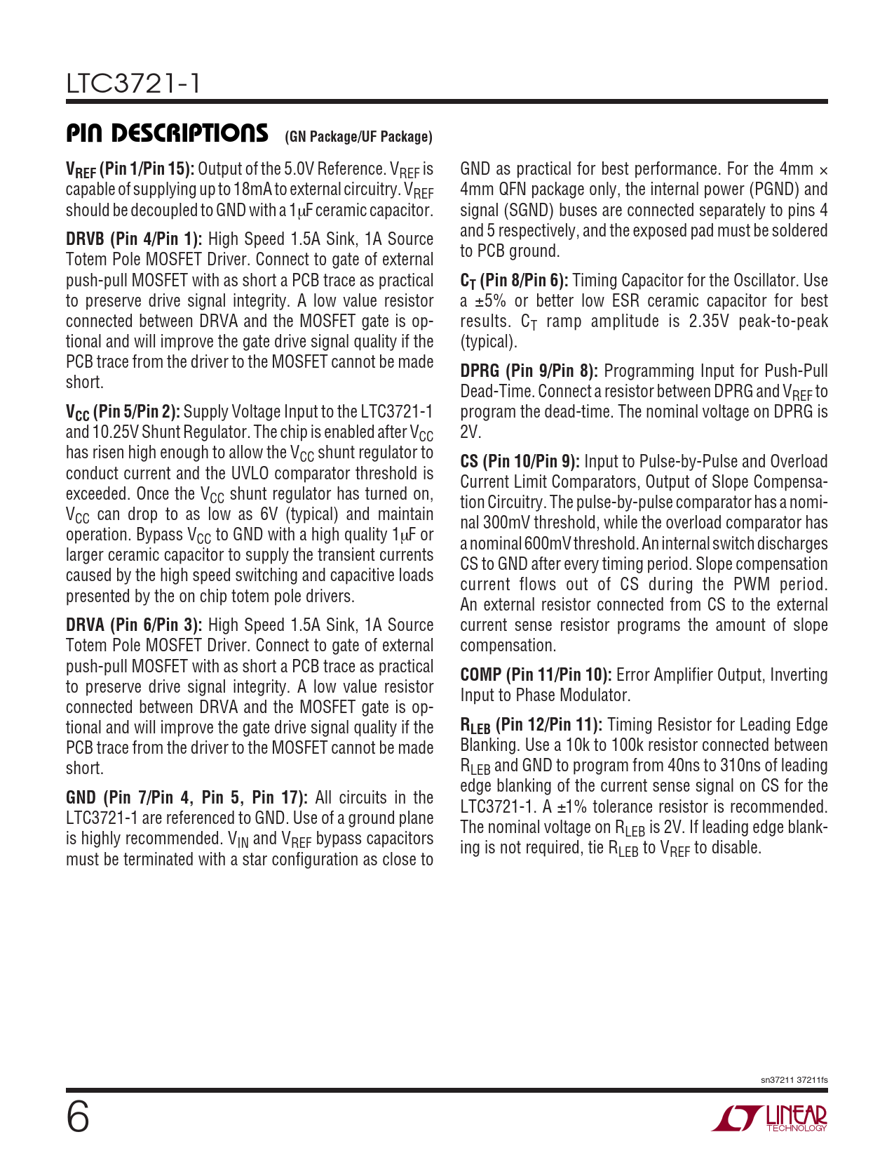 All circuits in the LTC3721-1. A ±1% tolerance resistor is recommended. LTC3721-1 are referenced to GND. Use of a ground plane The nominal voltage on R is highly recommended. V LEB is 2V. If leading edge blank- IN and VREF bypass capacitors ing is not required, tie R must be terminated with a star configuration as close to LEB to VREF to disable. sn37211 37211fs 6
