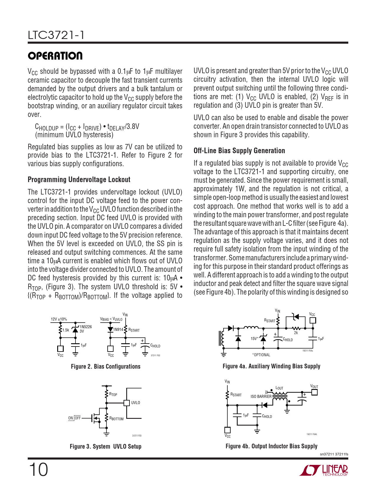 LTC3721-1 UOPERATIO VCC should be bypassed with a 0.1µF to 1µF multilayer UVLO is present and greater than 5V prior to the VCC UVLO ceramic capacitor to decouple the fast transient currents circuitry activation, then the internal UVLO logic will demanded by the output drivers and a bulk tantalum or prevent output switching until the following three condi- electrolytic capacitor to hold up the VCC supply before the tions are met: (1) VCC UVLO is enabled, (2) VREF is in bootstrap winding, or an auxiliary regulator circuit takes regulation and (3) UVLO pin is greater than 5V. over. UVLO can also be used to enable and disable the power CHOLDUP = (ICC + IDRIVE) • tDELAY/3.8V converter. An open drain transistor connected to UVLO as (minimum UVLO hysteresis) shown in Figure 3 provides this capability. Regulated bias supplies as low as 7V can be utilized to Off-Line Bias Supply Generation provide bias to the LTC3721-1. Refer to Figure 2 for various bias supply configurations. If a regulated bias supply is not available to provide VCC voltage to the LTC3721-1 and supporting circuitry, one Programming Undervoltage Lockout must be generated. Since the power requirement is small, The LTC3721-1 provides undervoltage lockout (UVLO) approximately 1W, and the regulation is not critical, a control for the input DC voltage feed to the power con- simple open-loop method is usually the easiest and lowest verter in addition to the V cost approach. One method that works well is to add a CC UVLO function described in the preceding section. Input DC feed UVLO is provided with winding to the main power transformer, and post regulate the UVLO pin. A comparator on UVLO compares a divided the resultant square wave with an L-C filter (see Figure 4a). down input DC feed voltage to the 5V precision reference. The advantage of this approach is that it maintains decent When the 5V level is exceeded on UVLO, the SS pin is regulation as the supply voltage varies, and it does not released and output switching commences. At the same require full safety isolation from the input winding of the time a 10µA current is enabled which flows out of UVLO transformer. Some manufacturers include a primary wind- into the voltage divider connected to UVLO. The amount of ing for this purpose in their standard product offerings as DC feed hysteresis provided by this current is: 10µA • well. A different approach is to add a winding to the output R inductor and peak detect and filter the square wave signal TOP, (Figure 3). The system UVLO threshold is: 5V • {(R (see Figure 4b). The polarity of this winding is designed so TOP + RBOTTOM)/RBOTTOM}. If the voltage applied to VIN VIN VCC 12V ±10% VBIAS < VUVLO RSTART 1N5226 1.5k 1N914 R 3V START + 2k + 15V* CHOLD 1µF 1µF 1µF CHOLD 19211 F04a V V 37211 F02 CC CC *OPTIONAL Figure 2. Bias ConfigurationsFigure 4a. Auxiliary Winding Bias Supply VIN VOUT LOUT RTOP RSTART + ISO BARRIER UVLO 1µF C ON OFF R HOLD BOTTOM 19211 F04b 37211 F03 VCC Figure 3. System UVLO SetupFigure 4b. Output Inductor Bias Supply sn37211 37211fs 10