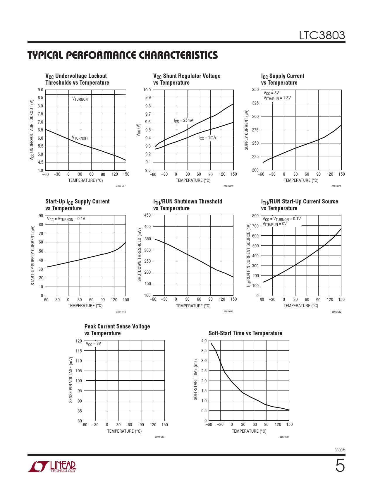 90 450 800 VCC = VTURNON – 0.1V VCC = VTURNON + 0.1V 80 V 400 700 ITH/RUN = 0V 70 600 350 60 500 50 300 400 40 250 300 30 200 200 20 SHUTDOWN THRESHOLD (mV) /RUN PIN CURRENT SOURCE (nA) START-UP SUPPLY CURRENT (μA) 150 10 I TH 100 0 100 0 –60 –30 0 30 60 90 120 150 –60 –30 0 30 60 90 120 150 –60 –30 0 30 60 90 120 150 TEMPERATURE (°C) TEMPERATURE (°C) TEMPERATURE (°C) 3803 G10 3803 G11 3803 G12