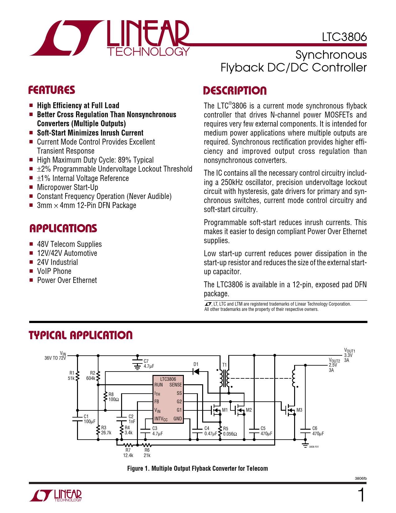 makes it easier to design compliant Power Over Ethernet ■ 48V Telecom Supplies supplies. ■ 12V/42V Automotive Low start-up current reduces power dissipation in the ■ 24V Industrial start-up resistor and reduces the size of the external start- ■ VoIP Phone up capacitor. ■ Power Over Ethernet The LTC3806 is available in a 12-pin, exposed pad DFN package. , LT, LTC and LTM are registered trademarks of Linear Technology Corporation. All other trademarks are the property of their respective owners.