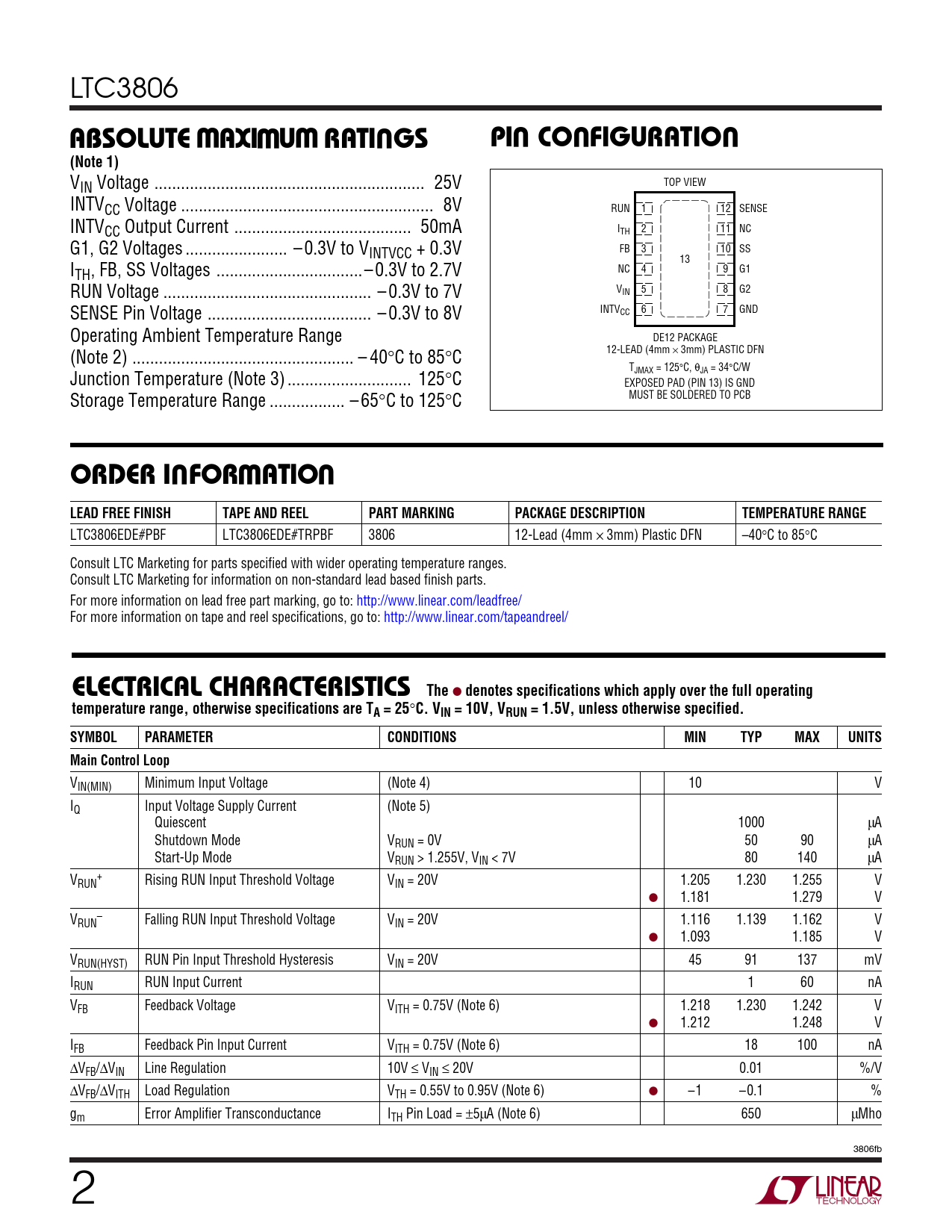 LTC3806 WWWUUUUABSOLUTE MAXIMUM RATINGSPI CO FIGURATIO(Note 1) TOP VIEW VIN Voltage ... 25V INTV RUN 1 12 SENSE CC Voltage ... 8V INTV I 2 11 NC TH CC Output Current .. 50mA FB 3 10 SS G1, G2 Voltages ... – 0.3V to VINTVCC + 0.3V 13 NC 4 9 G1 ITH, FB, SS Voltages ...–0.3V to 2.7V V 5 8 G2 IN RUN Voltage ... – 0.3V to 7V INTV 6 7 GND CC SENSE Pin Voltage ... – 0.3V to 8V Operating Ambient Temperature Range DE12 PACKAGE 12-LEAD (4mm × 3mm) PLASTIC DFN (Note 2) .. – 40°C to 85°C TJMAX = 125°C, θJA = 34°C/W Junction Temperature (Note 3) .. 125°C EXPOSED PAD (PIN 13) IS GND Storage Temperature Range ... – 65°C to 125°C MUST BE SOLDERED TO PCB UWUORDER I FOR ATIOLEAD FREE FINISHTAPE AND REELPART MARKINGPACKAGE DESCRIPTIONTEMPERATURE RANGE LTC3806EDE#PBF LTC3806EDE#TRPBF 3806 12-Lead (4mm × 3mm) Plastic DFN –40°C to 85°C Consult LTC Marketing for parts specified with wider operating temperature ranges. Consult LTC Marketing for information on non-standard lead based finish parts. For more information on lead free part marking, go to: http://www.linear.com/leadfree/ For more information on tape and reel specifications, go to: http://www.linear.com/tapeandreel/ ELECTRICAL CHARACTERISTICS The ● denotes specifications which apply over the full operatingtemperature range, otherwise specifications are TA = 25 ° C. VIN = 10V, VRUN = 1.5V, unless otherwise specified.SYMBOLPARAMETERCONDITIONSMINTYPMAXUNITSMain Control Loop VIN(MIN) Minimum Input Voltage (Note 4) 10 V IQ Input Voltage Supply Current (Note 5) Quiescent 1000 μA Shutdown Mode VRUN = 0V 50 90 μA Start-Up Mode VRUN > 1.255V, VIN < 7V 80 140 μA V + RUN Rising RUN Input Threshold Voltage VIN = 20V 1.205 1.230 1.255 V ● 1.181 1.279 V V – RUN Falling RUN Input Threshold Voltage VIN = 20V 1.116 1.139 1.162 V ● 1.093 1.185 V VRUN(HYST) RUN Pin Input Threshold Hysteresis VIN = 20V 45 91 137 mV IRUN RUN Input Current 1 60 nA VFB Feedback Voltage VITH = 0.75V (Note 6) 1.218 1.230 1.242 V ● 1.212 1.248 V IFB Feedback Pin Input Current VITH = 0.75V (Note 6) 18 100 nA ΔVFB/ΔVIN Line Regulation 10V ≤ VIN ≤ 20V 0.01 %/V ΔVFB/ΔVITH Load Regulation VTH = 0.55V to 0.95V (Note 6) ● –1 –0.1 % gm Error Amplifier Transconductance ITH Pin Load = ±5μA (Note 6) 650 μMho 3806fb 2