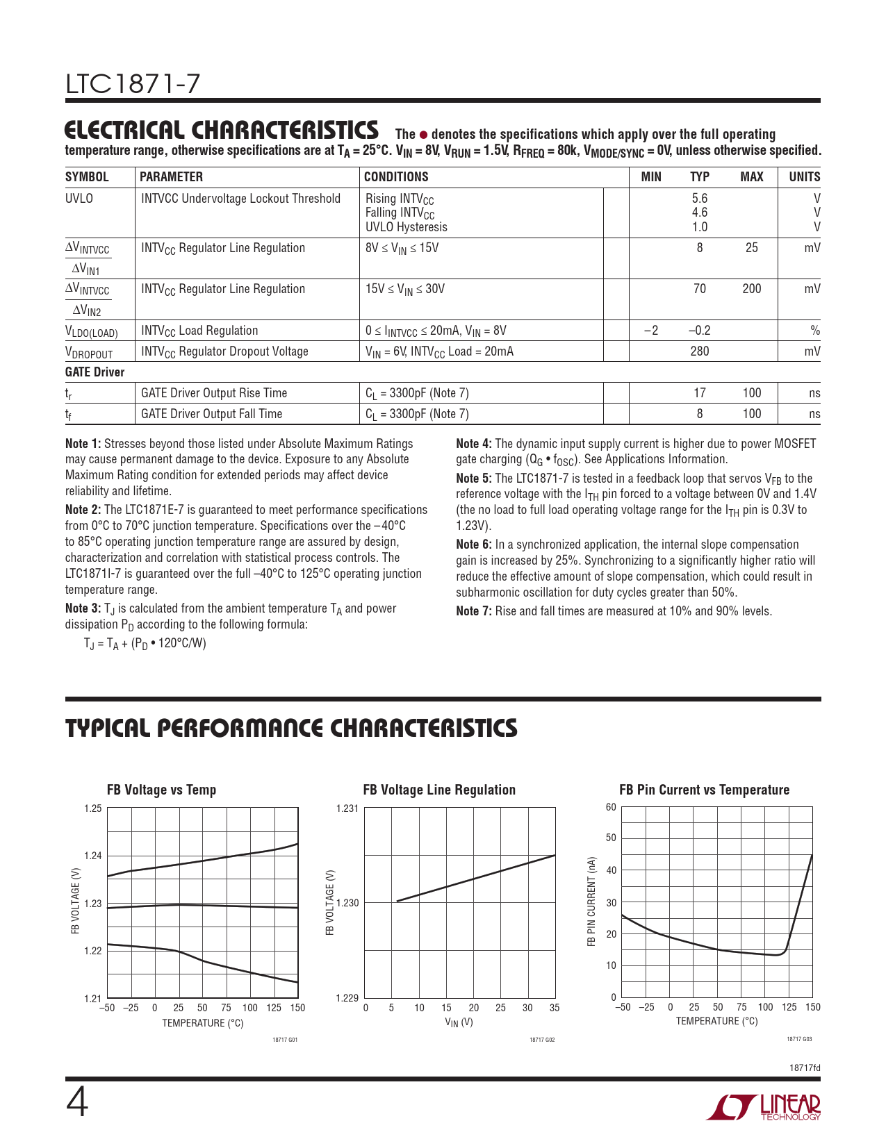 LTC1871-7 elecTrical characTerisTicsThe l denotes the specifications which apply over the full operatingtemperature range, otherwise specifications are at TA = 25°C. VIN = 8V, VRUN = 1.5V, RFREQ = 80k, VMODE/SYNC = 0V, unless otherwise specified. SYMBOLPARAMETERCONDITIONSMINTYPMAXUNITS UVLO INTVCC Undervoltage Lockout Threshold Rising INTVCC 5.6 V Falling INTVCC 4.6 V UVLO Hysteresis 1.0 V ∆VINTVCC INTVCC Regulator Line Regulation 8V ≤ VIN ≤ 15V 8 25 mV ∆VIN1 ∆VINTVCC INTVCC Regulator Line Regulation 15V ≤ VIN ≤ 30V 70 200 mV ∆VIN2 VLDO(LOAD) INTVCC Load Regulation 0 ≤ IINTVCC ≤ 20mA, VIN = 8V –2 –0.2 % VDROPOUT INTVCC Regulator Dropout Voltage VIN = 6V, INTVCC Load = 20mA 280 mV GATE Driver tr GATE Driver Output Rise Time CL = 3300pF (Note 7) 17 100 ns tf GATE Driver Output Fall Time CL = 3300pF (Note 7) 8 100 ns Note 1: Stresses beyond those listed under Absolute Maximum Ratings Note 4: The dynamic input supply current is higher due to power MOSFET may cause permanent damage to the device. Exposure to any Absolute gate charging (QG • fOSC). See Applications Information. Maximum Rating condition for extended periods may affect device Note 5: The LTC1871-7 is tested in a feedback loop that servos VFB to the reliability and lifetime. reference voltage with the ITH pin forced to a voltage between 0V and 1.4V Note 2: The LTC1871E-7 is guaranteed to meet performance specifications (the no load to full load operating voltage range for the ITH pin is 0.3V to from 0°C to 70°C junction temperature. Specifications over the –40°C 1.23V). to 85°C operating junction temperature range are assured by design, Note 6: In a synchronized application, the internal slope compensation characterization and correlation with statistical process controls. The gain is increased by 25%. Synchronizing to a significantly higher ratio will LTC1871I-7 is guaranteed over the full –40°C to 125°C operating junction reduce the effective amount of slope compensation, which could result in temperature range. subharmonic oscillation for duty cycles greater than 50%. Note 3: TJ is calculated from the ambient temperature TA and power Note 7: Rise and fall times are measured at 10% and 90% levels. dissipation PD according to the following formula: TJ = TA + (PD • 120°C/W) Typical perForMance characTerisTicsFB Voltage vs TempFB Voltage Line RegulationFB Pin Current vs Temperature 1.25 1.231 60 50 1.24 40 1.23 1.230 30 FB VOLTAGE (V) FB VOLTAGE (V) 20 FB PIN CURRENT (nA) 1.22 10 1.21 1.229 0 –50 –25 0 25 50 75 100 125 150 0 5 10 15 20 25 30 35 –50 –25 0 25 50 75 100 125 150 TEMPERATURE (°C) VIN (V) TEMPERATURE (°C) 18717 G01 18717 G02 18717 G03 18717fd 4 Document Outline Features Applications Description Typical Application Absolute Maximum Ratings Pin Configuration Order Information Electrical Characteristics Typical Performance Characteristics Pin Functions Block Diagram Operation Applications Information Typical Applications Package Description Revision History Typical Application Related Parts