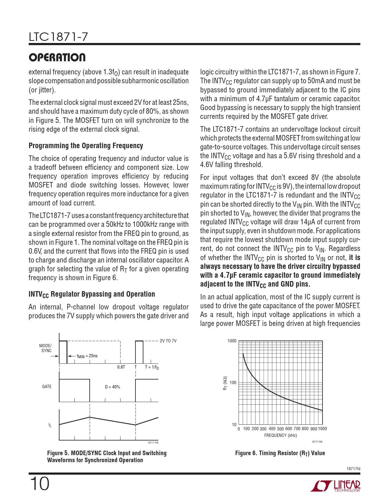 LTC1871-7 operaTion external frequency (above 1.3fO) can result in inadequate logic circuitry within the LTC1871-7, as shown in Figure 7. slope compensation and possible subharmonic oscillation The INTVCC regulator can supply up to 50mA and must be (or jitter). bypassed to ground immediately adjacent to the IC pins The external clock signal must exceed 2V for at least 25ns, with a minimum of 4.7µF tantalum or ceramic capacitor. and should have a maximum duty cycle of 80%, as shown Good bypassing is necessary to supply the high transient in Figure 5. The MOSFET turn on will synchronize to the currents required by the MOSFET gate driver. rising edge of the external clock signal. The LTC1871-7 contains an undervoltage lockout circuit which protects the external MOSFET from switching at low Programming the Operating Frequency gate-to-source voltages. This undervoltage circuit senses The choice of operating frequency and inductor value is the INTVCC voltage and has a 5.6V rising threshold and a a tradeoff between efficiency and component size. Low 4.6V falling threshold. frequency operation improves efficiency by reducing For input voltages that don’t exceed 8V (the absolute MOSFET and diode switching losses. However, lower maximum rating for INTVCC is 9V), the internal low dropout frequency operation requires more inductance for a given regulator in the LTC1871-7 is redundant and the INTVCC amount of load current. pin can be shorted directly to the VIN pin. With the INTVCC The LTC1871-7 uses a constant frequency architecture that pin shorted to VIN, however, the divider that programs the can be programmed over a 50kHz to 1000kHz range with regulated INTVCC voltage will draw 14µA of current from a single external resistor from the FREQ pin to ground, as the input supply, even in shutdown mode. For applications shown in Figure 1. The nominal voltage on the FREQ pin is that require the lowest shutdown mode input supply cur- 0.6V, and the current that flows into the FREQ pin is used rent, do not connect the INTVCC pin to VIN. Regardless to charge and discharge an internal oscillator capacitor. A of whether the INTVCC pin is shorted to VIN or not, it is graph for selecting the value of R always necessary to have the driver circuitry bypassed T for a given operating frequency is shown in Figure 6. with a 4.7µF ceramic capacitor to ground immediatelyadjacent to the INTVCC and GND pins.INTVCC Regulator Bypassing and Operation In an actual application, most of the IC supply current is An internal, P-channel low dropout voltage regulator used to drive the gate capacitance of the power MOSFET. produces the 7V supply which powers the gate driver and As a result, high input voltage applications in which a large power MOSFET is being driven at high frequencies 2V TO 7V 1000 MODE/ SYNC tMIN = 25ns 0.8T T T = 1/fO 100 GATE (kΩ) D = 40% R T IL 10 0 100 200 300 400 500 600 700 800 9001000 FREQUENCY (kHz) 18717 F05 18717 F06 Figure 5. MODE/SYNC Clock Input and SwitchingFigure 6. Timing Resistor (RT) ValueWaveforms for Synchronized Operation 18717fd 10 Document Outline Features Applications Description Typical Application Absolute Maximum Ratings Pin Configuration Order Information Electrical Characteristics Typical Performance Characteristics Pin Functions Block Diagram Operation Applications Information Typical Applications Package Description Revision History Typical Application Related Parts